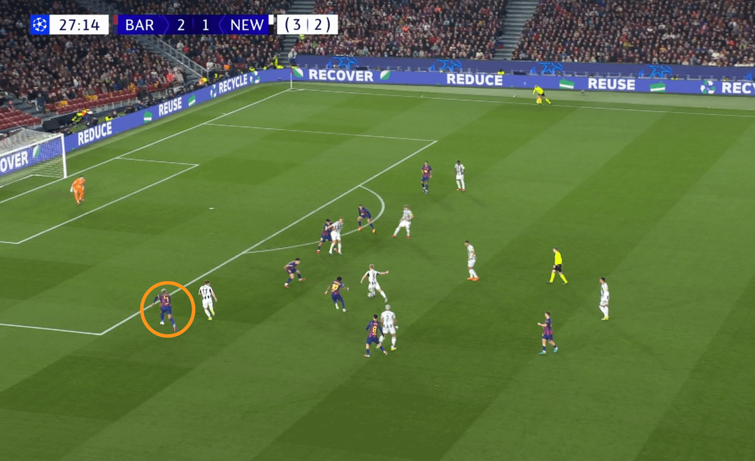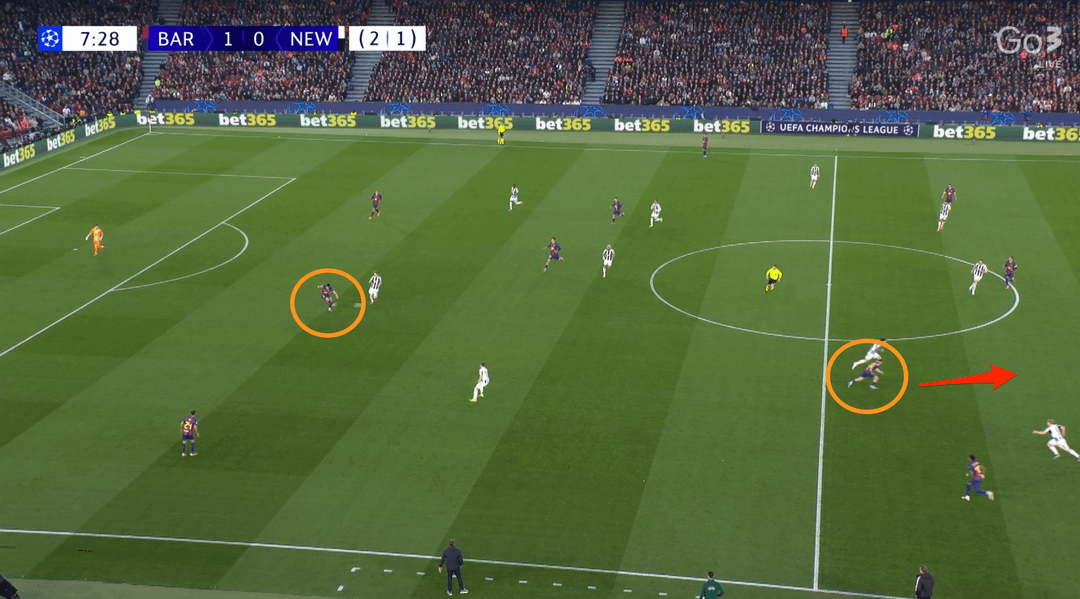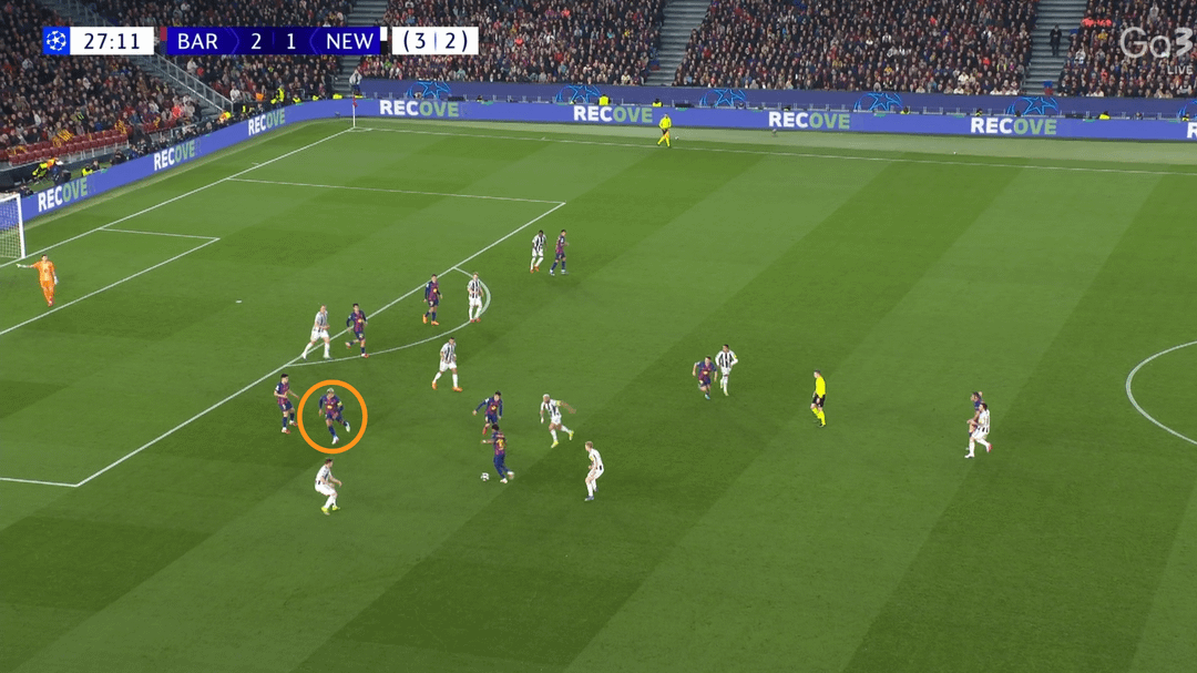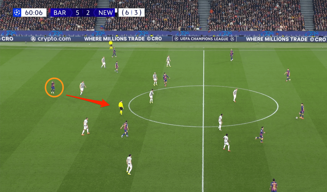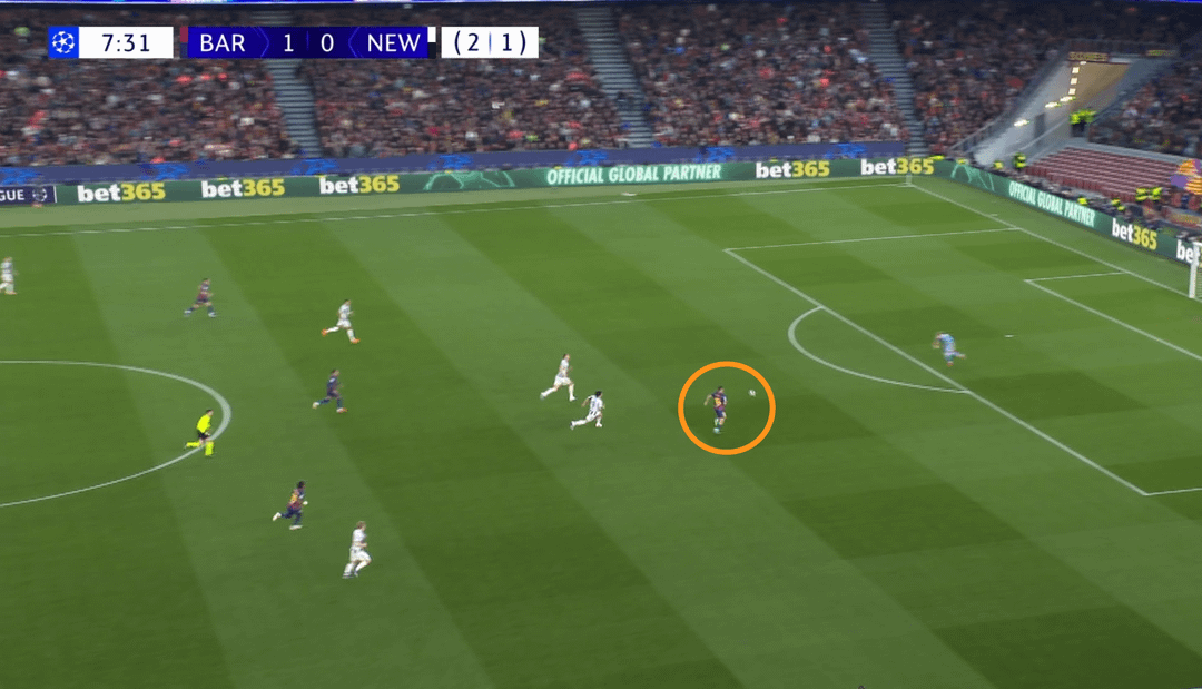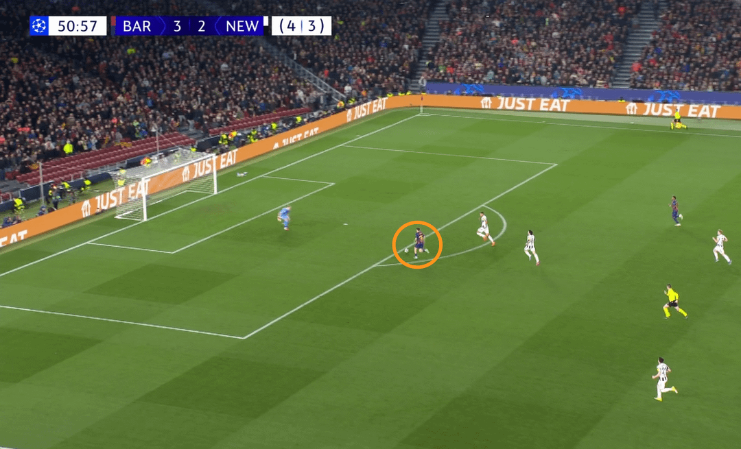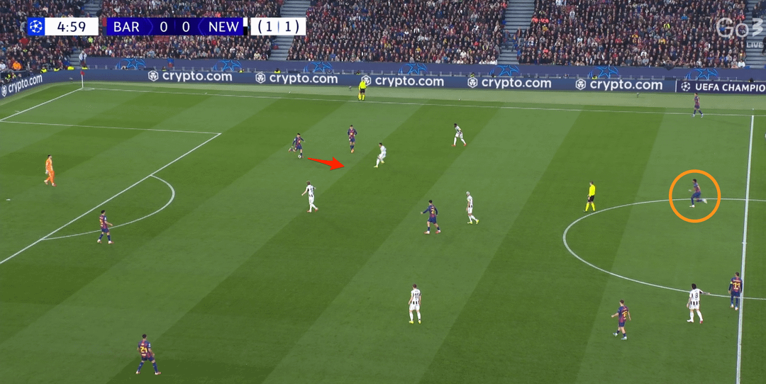 Barcelona wasn’t afraid to use long balls behind defenders — on the 8th minute Cubarsi spotted Fermin’s run and played him in; only the goalkeeper prevented a goal for Newcastle.