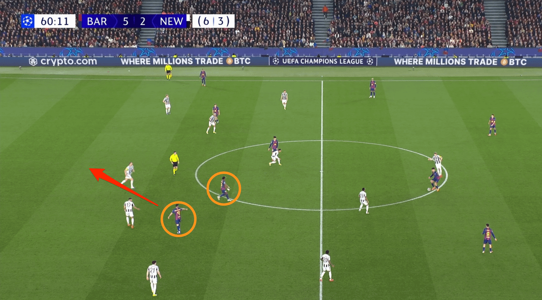 Gerard had the ball in Barcelona’s half, Lewandowski dropped deep, Bern followed, Fermin accelerated into space in Newcastle’s defense, Tonali lost position early, Rafinha’s pass to Lopez — goal.