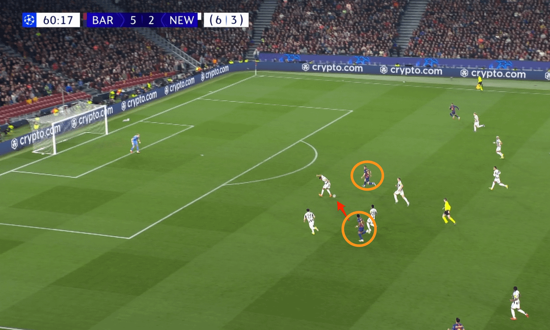 Newcastle repeated similar attacks three more times: ball recovery, switch to the flank, cross into the box — one time Barcelona caught Elanga offside, another time Cubarsi cleared a dangerous cross, the third time Hall fed directly to Garcia.