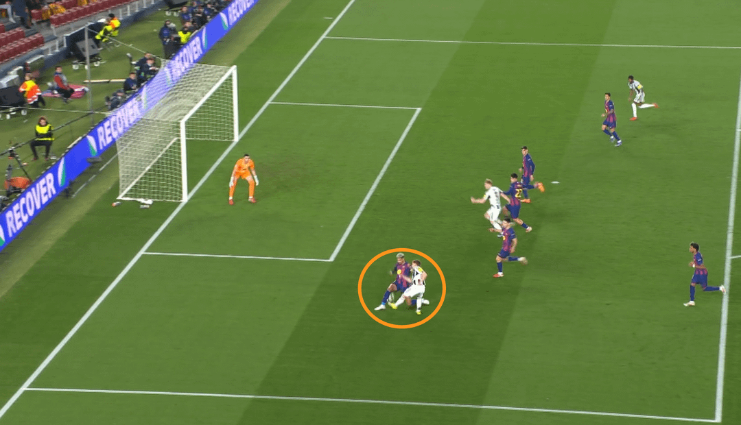 Yamal’s backheel near his own box went wrong. Hall intercepted, immediate attack. Coordination between Araujo and the other defenders was off — Cancelo, Martin, and Cubarsi held the offside line, while Ronald followed Barnes, letting him escape offside.