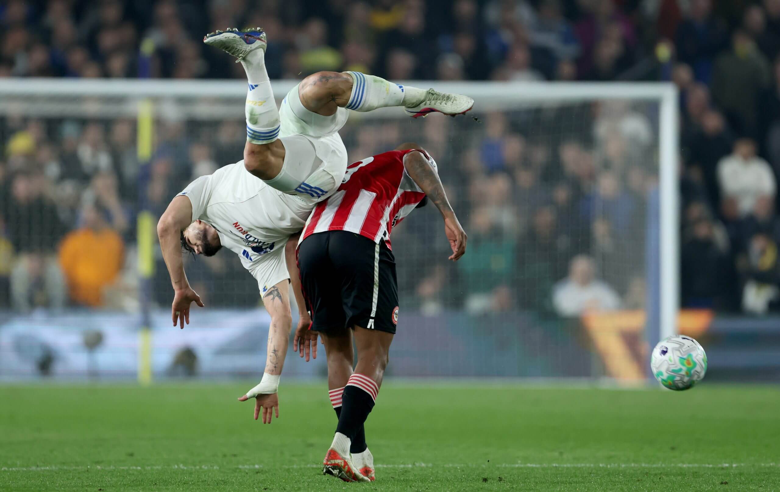 Pascal Struijk and Brentford’s Igor Thiago collide (Photo: Richard Sellers/PA Images via Getty Images)
