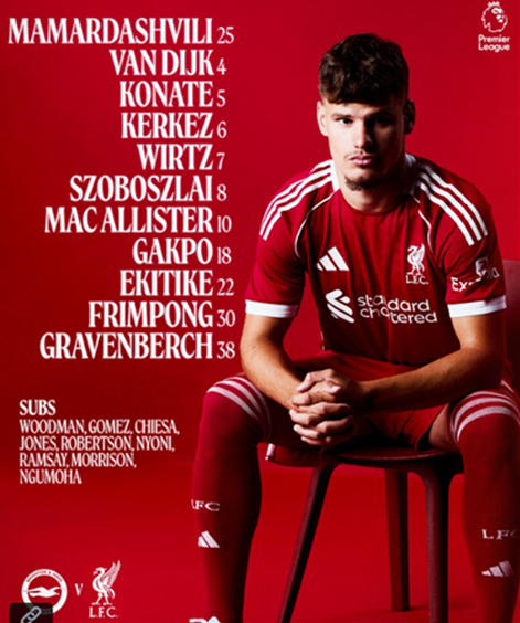 Mo Salah is missing from the Liverpool squad but former Albion midfield Alexis Mac Allister is down to start, with Hugo Ekitike up front.