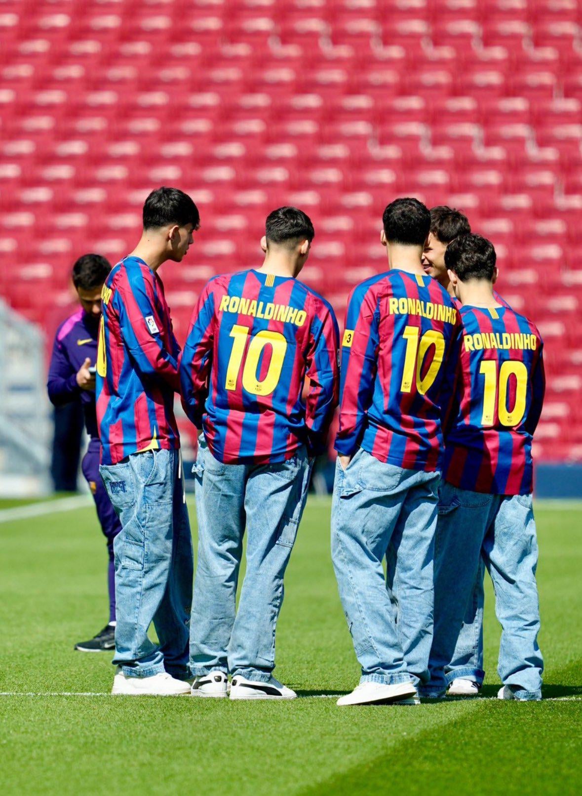 All Barça players are currently out on the pitch wearing a classic Barcelona jersey (2005/06) with Ronaldinho on the back as a tribute to his birthday yesterday.