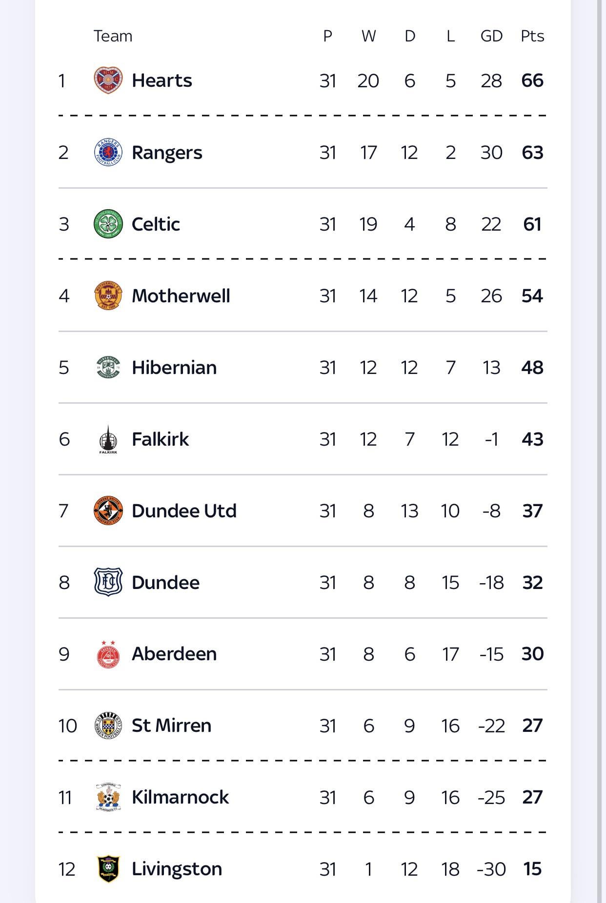 1. If it comes down to goal difference it’s going to be hard for Celtic to catch up on that front. They have not been scoring much this season.