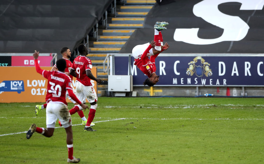 Antoine Semenyo celebrates scoring for Bristol City in style