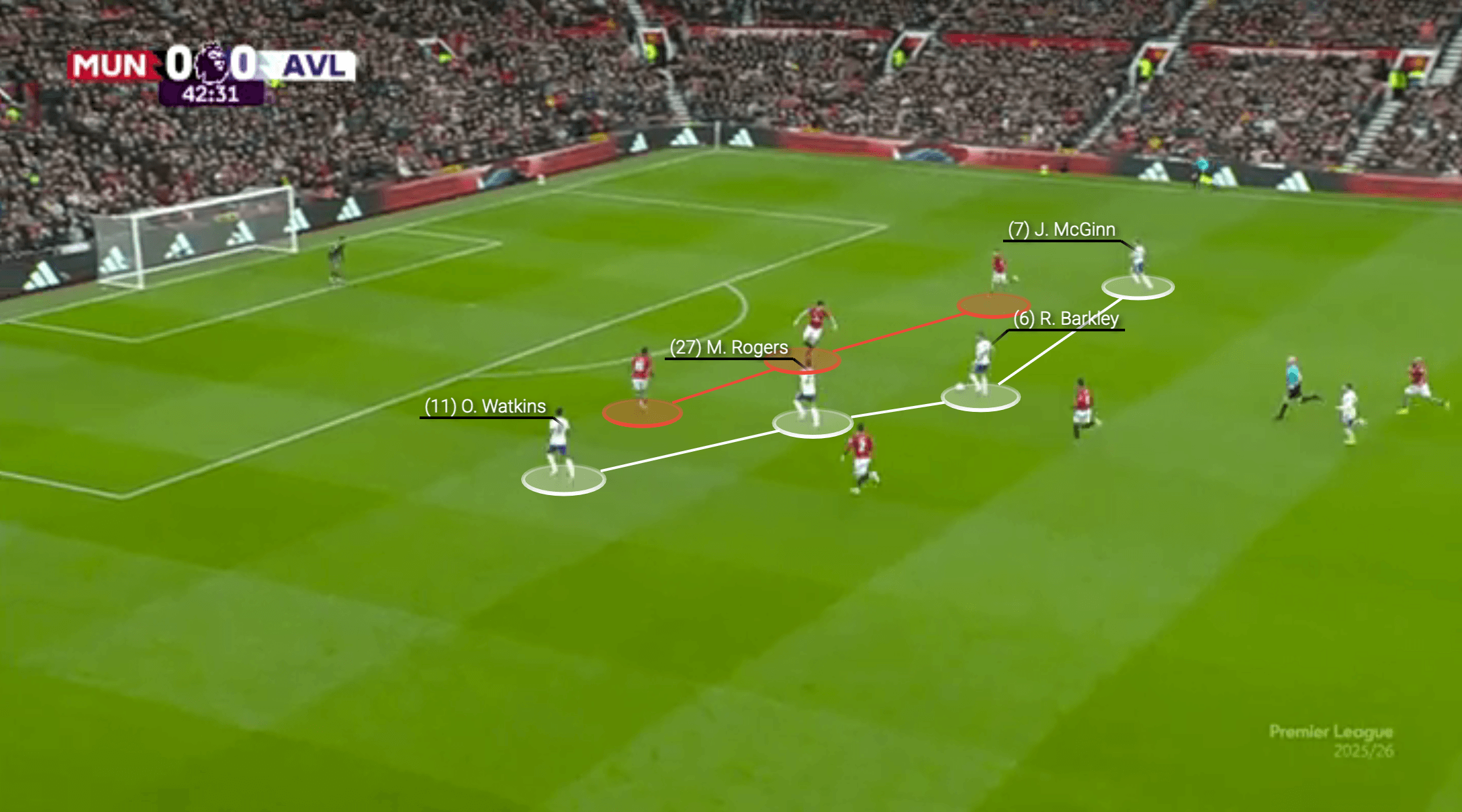 Villa retained the ability to move the ball upfield efficiently, as illustrated by their attacking shape in the image below. Too often, however, the end product was wasteful, or attacks merely fizzled out — as was the case in this foray upfield at Old Trafford.