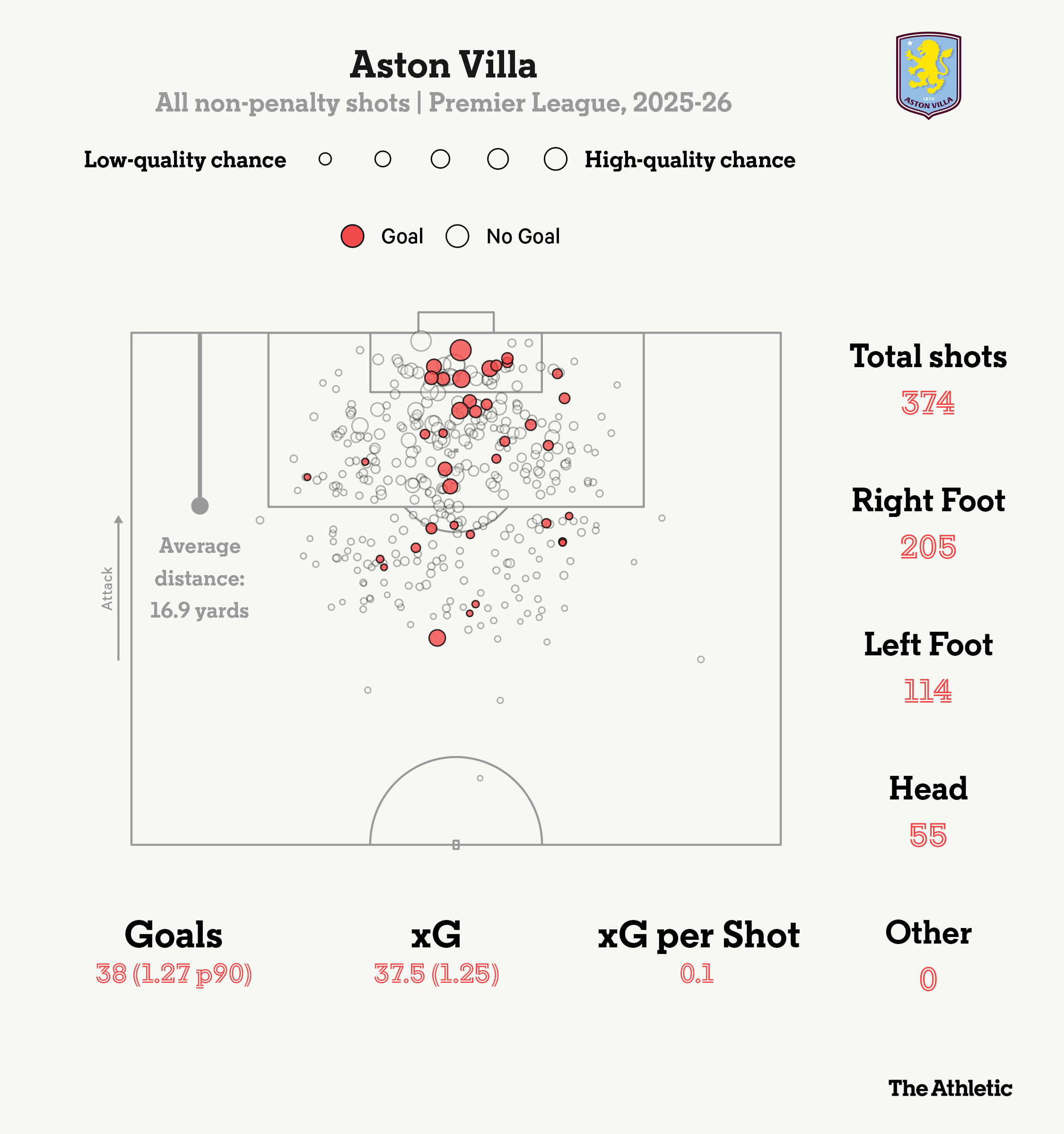 Villa average 12.5 non-penalty shots per 90 minutes, serving as the exact median across top-flight clubs. Crucially, their average xG per shot (0.1) is the seventh worst in the league.
