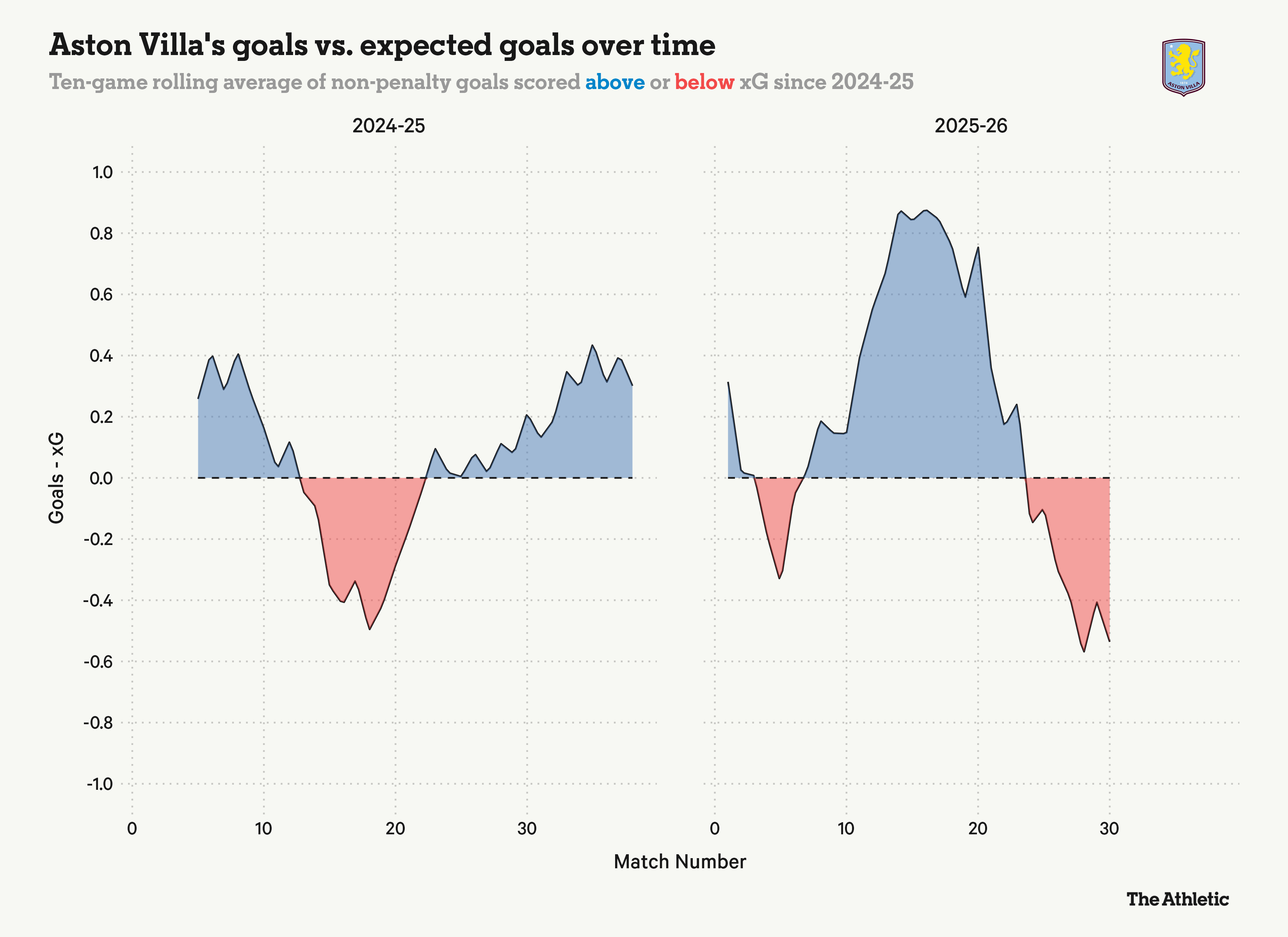 When Villa were overperforming the expected goals (xG) metrics, supporters took those observations as criticism, insisting they undermined the team’s impressive response.