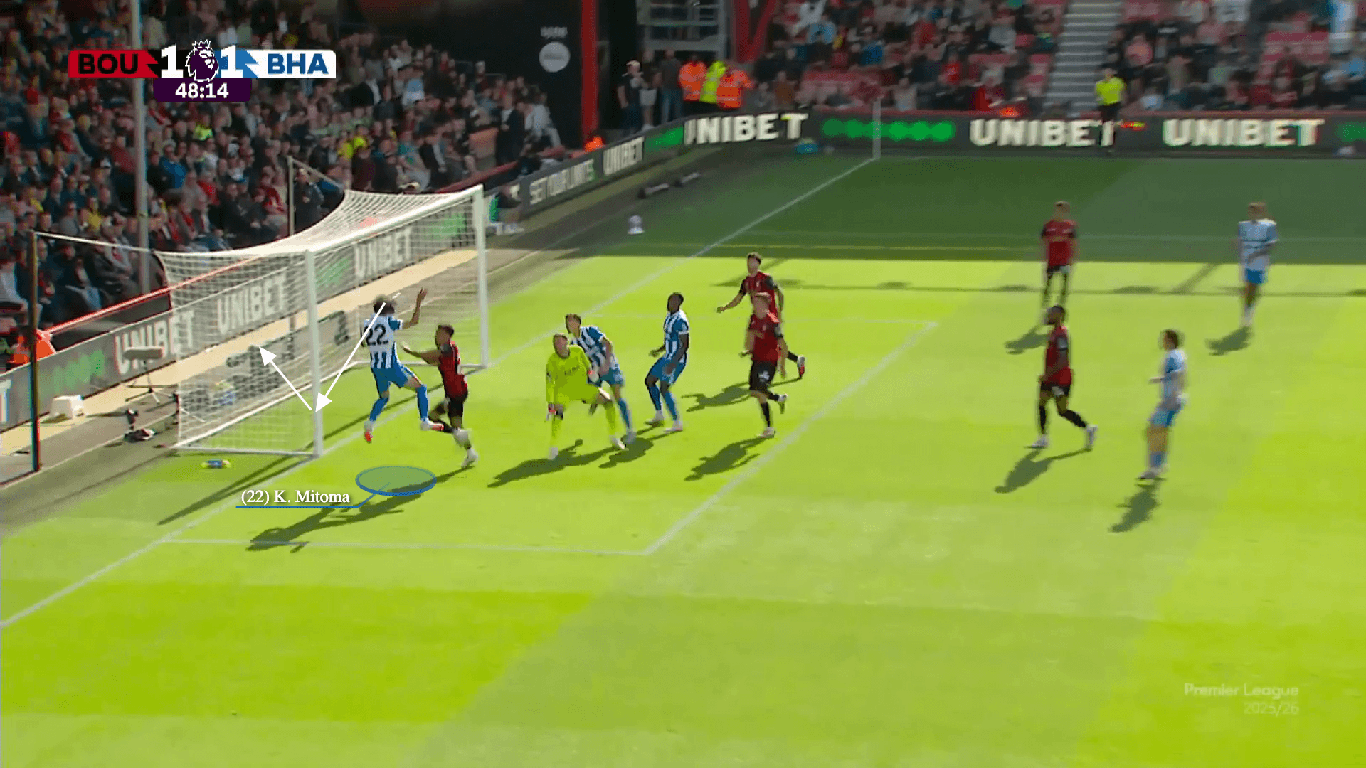 The remainder of Bournemouth’s back four are defending Welbeck and Mitoma, while Tyler Adams is keeping an eye on Rutter.