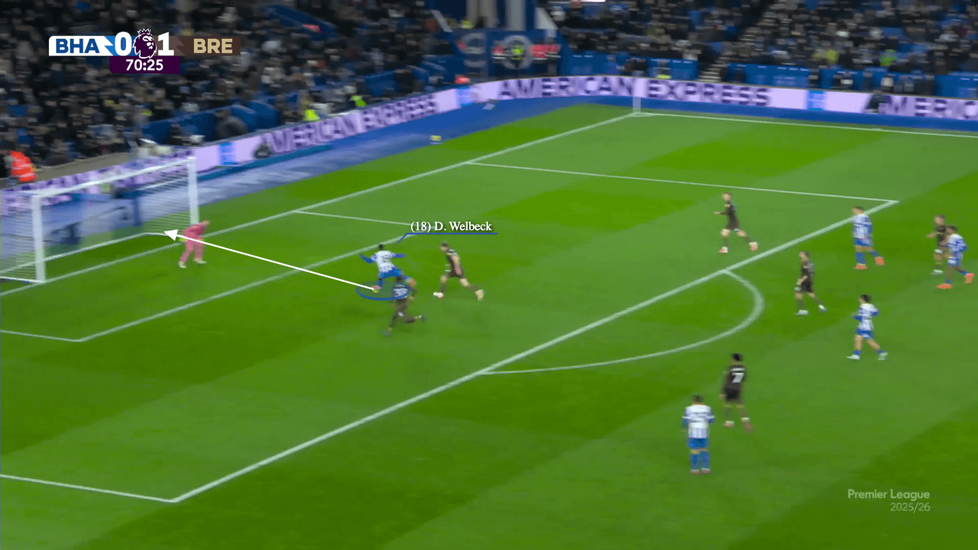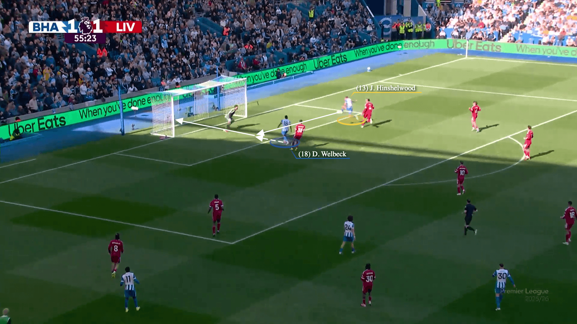 In the two-v-two situation inside the penalty area, Minteh’s perfect cross gives Brighton the advantage, and the timing of Jack Hinshelwood and Welbeck’s runs snatch it.