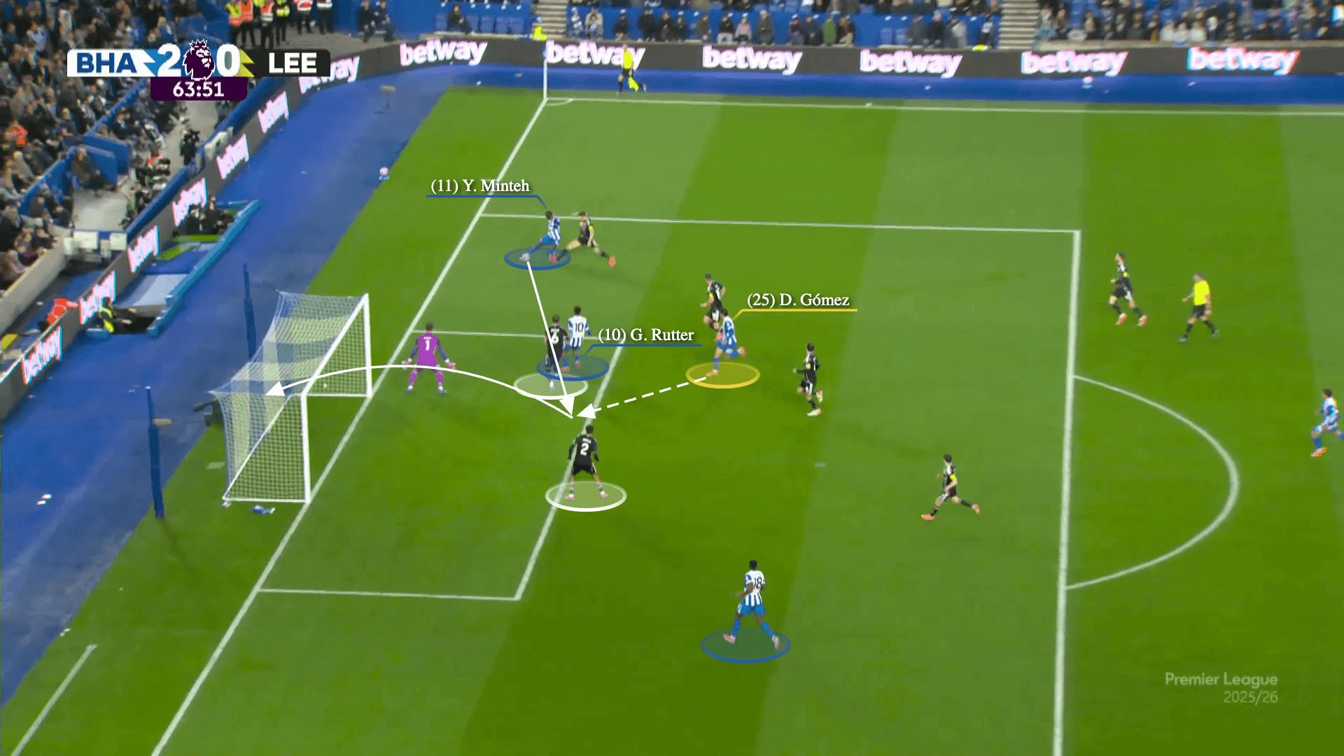 As Minteh dribbles past Gabriel Gudmundsson, Rutter attacks the near post and Gomez dashes behind Bijol, with Welbeck in position to threaten the back post.