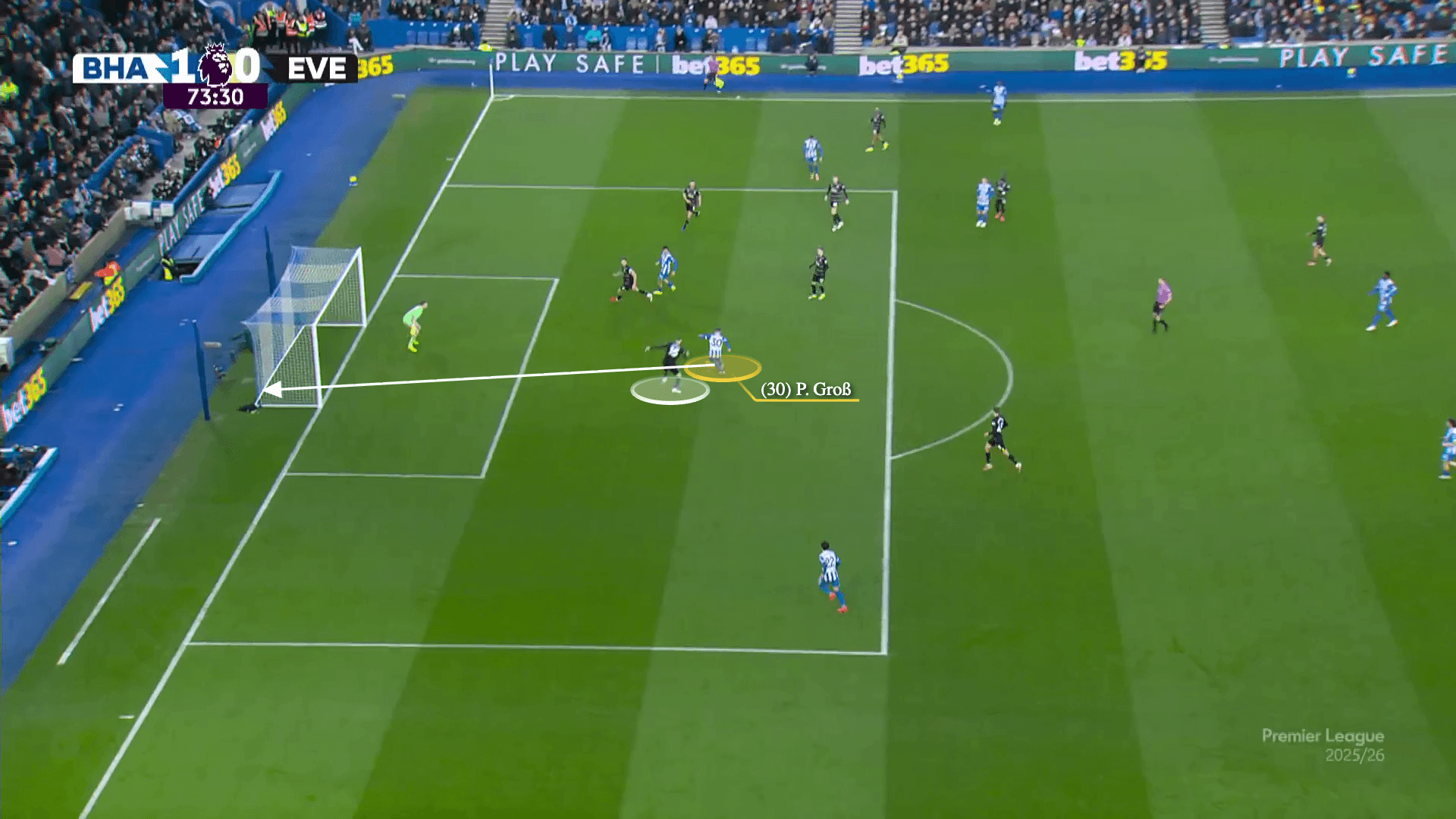 The positioning of the Brighton players across the front line and the speed of the move prevents O’Brien from defending Gross in time…