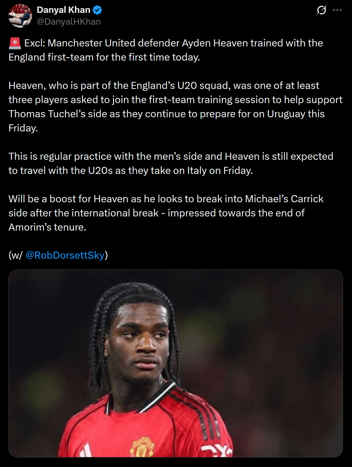 [Danyal Khan, Sky] 🚨 Excl: Manchester United defender Ayden Heaven trained with the England first-team for the first time today.