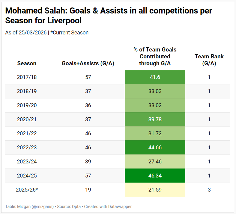 We move from just goals to overall goal contributions (goals + assists) and look at how much of the team’s total goals came through Salah, whether via a goal or an assist, across all competitions. Just a heads up: the numbers are insane.