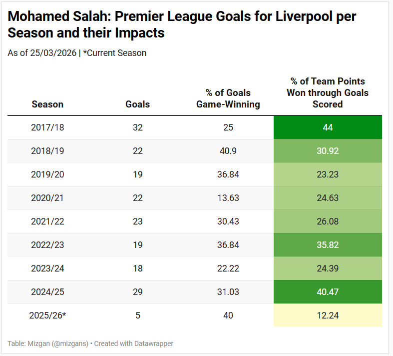 When it comes to points won through goals scored (be it one for a draw or three for a win), his first season at Anfield was simply out of this world, with 44% of the team’s points coming from his goals. He did not touch the 40% mark after that (although he kept the number relatively high) until last season, where his goals earned 40.47% of the points for the Reds as they walked the league in Arne Slot’s first season in charge.