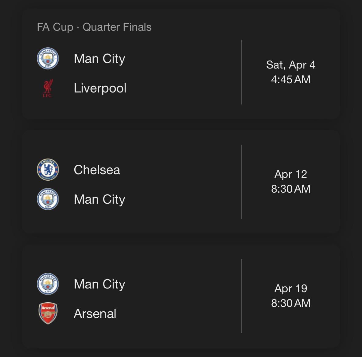 This schedule, although quite scary playing three major teams back to back, looks far better than what it could have been with playing Kompany’s formidable Bayern Munich twice in between, resulting in a tough match every three days and possibly Bayern away before the all important Arsenal match. I’m much more confident of us doing well in these matches since we get more time with weekly schedule. Hopefully we get the 9 points from these three games to keep the PL dream alive.