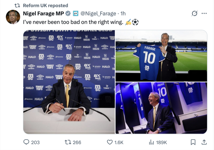 Reform UK leader Nigel Farage visiting Portman Road yesterday had no official involvement from the club, TWTD understands.