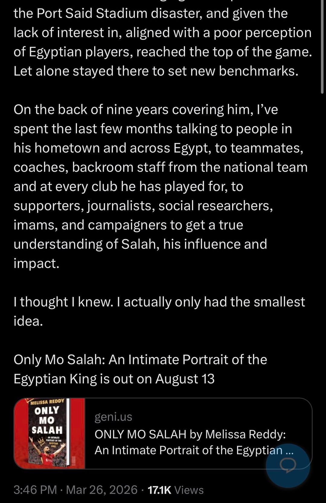 Just saw that Melissa Reddy announced she’s written a biography of Mo Salah, titled “Only Mo Salah: An Intimate Portrait of the Egyptian King”. Thought it was pretty cool and well-timed all things considered – and the cover looks awesome too. Will definitely be buying it when it’s out in August. Just thought I’d share here in case there were any other Liverpool book fanatics like me 🙂
