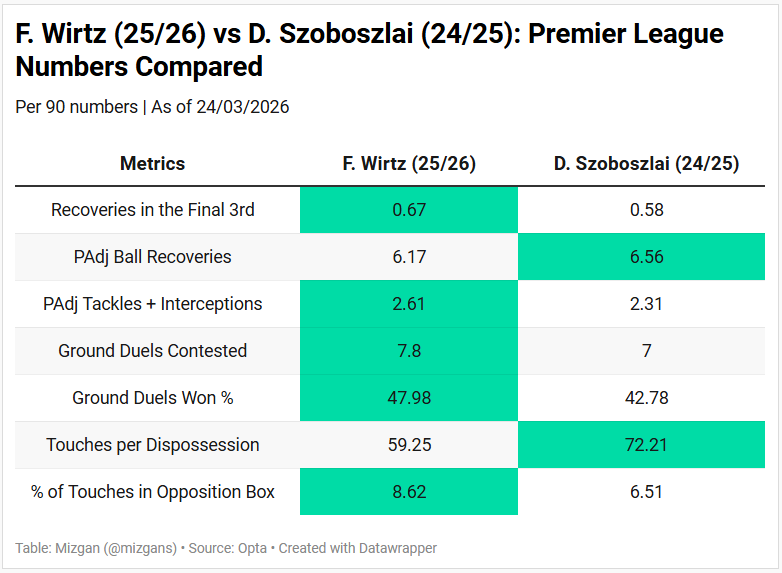 While Wirtz may never match Szoboszlai’s relentless ground coverage off the ball, his overall defensive numbers this season have been impressive and remain comparable to the Hungarian’s output in a similar role last year.