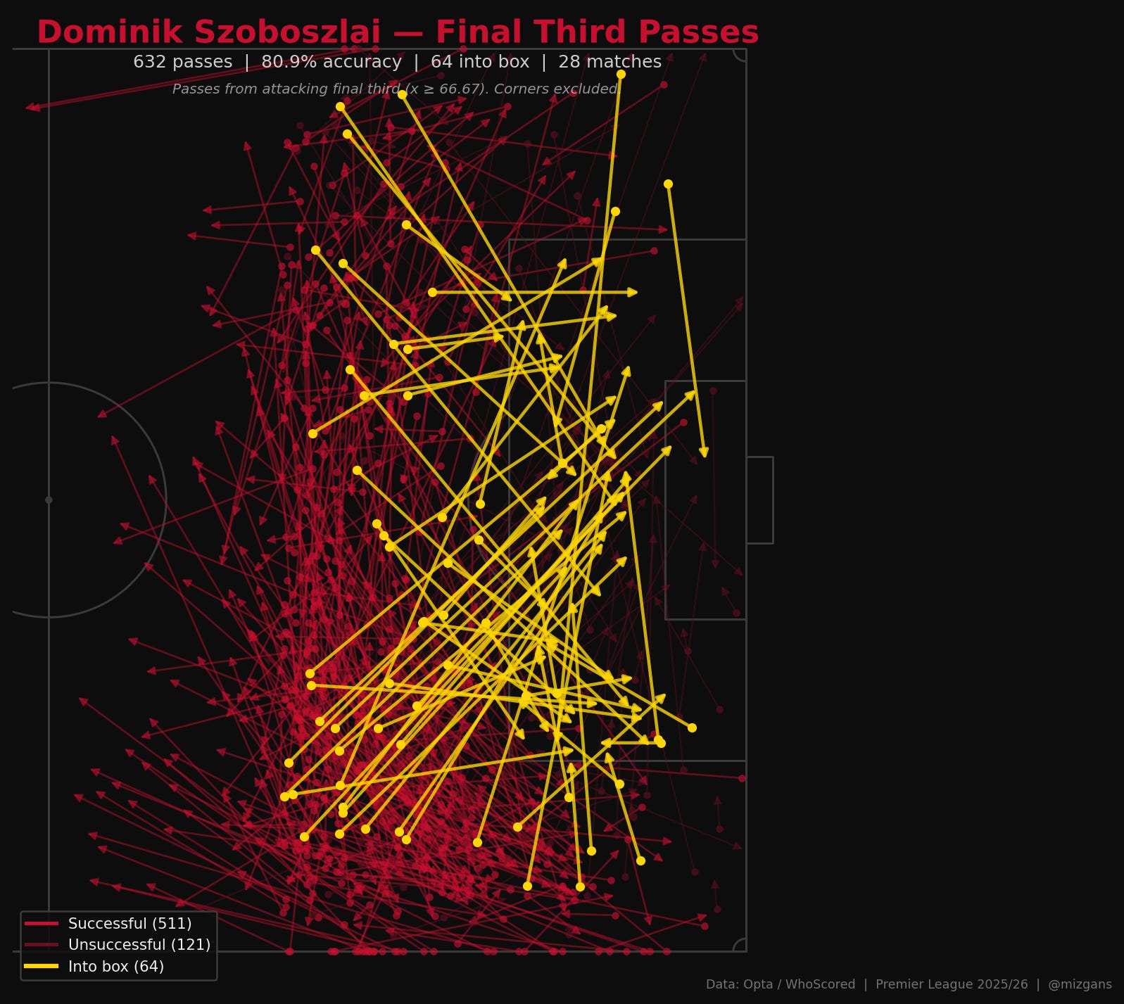 Furthermore, Wirtz’s high proportion of touches in the opposition box shows that he operates closer to the goal than Szoboszlai did by comparison (understandably so, even in the eye test).
