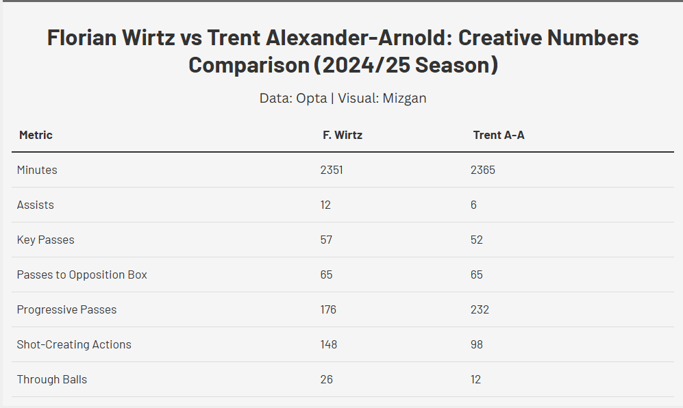 In Wirtz, they got a player who, last season, produced very similar chance-creating numbers to what Alexander-Arnold produced in a Liverpool shirt before shipping off to Real Madrid. We have the table below to showcase that.