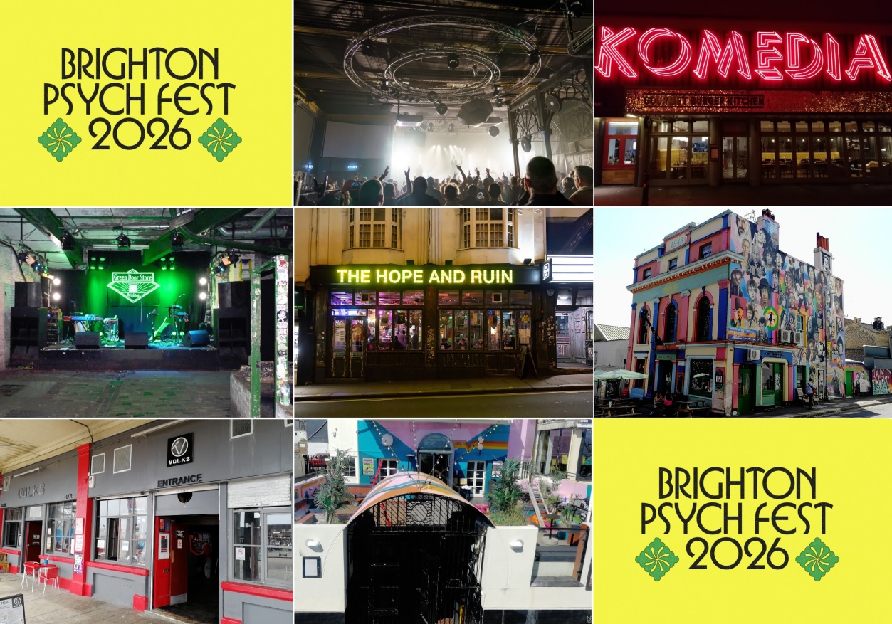 Brighton Psych Fest venues: Concorde 2 (pic Andy Sturmey), Komedia (pic Nick Linazasoro), Green Door Store (pic Nick Linazasoro), The Hope & Ruin (pic Petra Eujane), The Prince Albert (pic Nick Linazasoro), Volks (pic Nick Linazasoro), and Patterns (pic Nick Linazasoro)