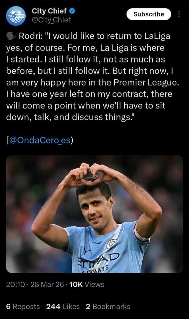 To me we would not have won the cup final last weekend without Rodri. Along with so many other games, including the UCL final we finally won. He can shoot his mouth off and lead Real Madrid fans on and I may not like it, but it doesn’t make me want him out of the team. I think we should sign him to a 3 year deal right now.