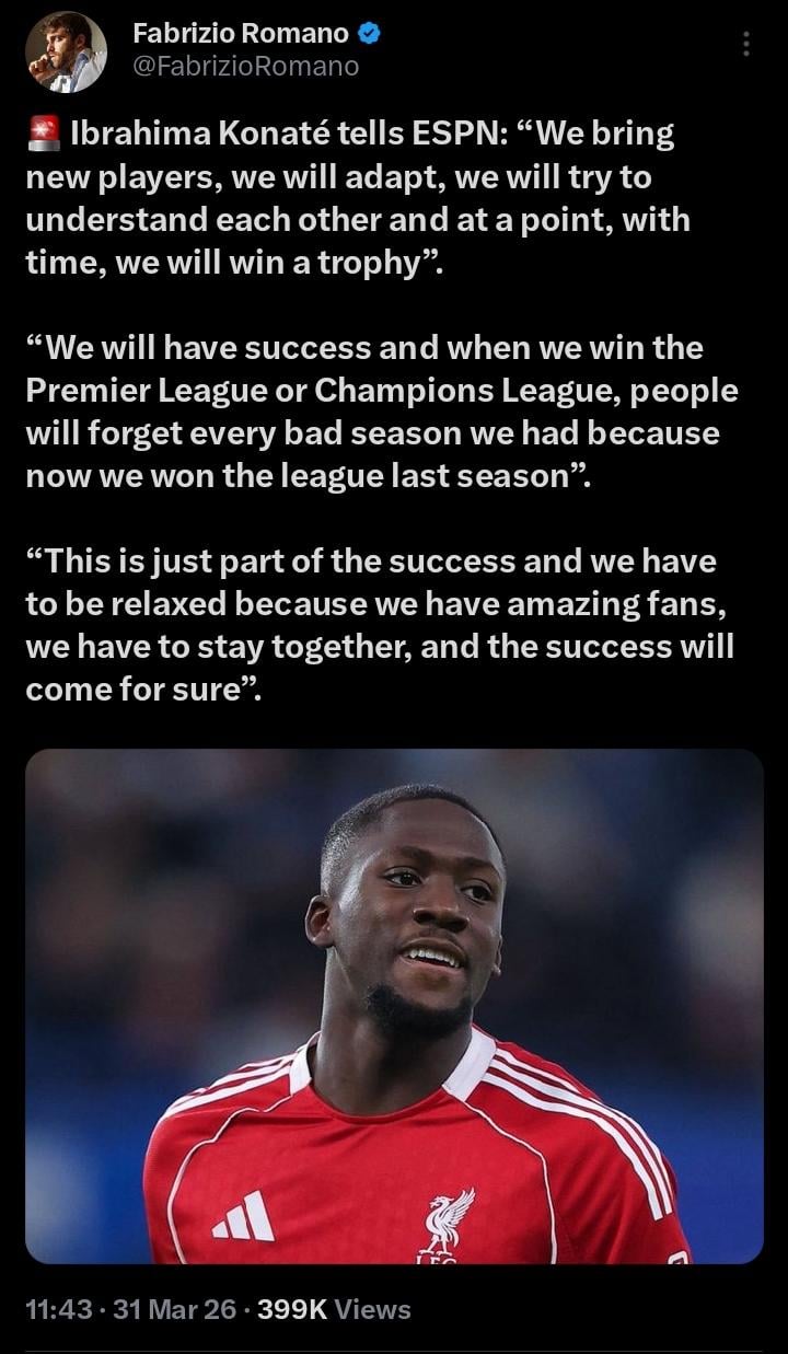 Share Facebook Twitter LinkedIn Pinterest Bluesky Threads 🚨 Ibrahima Konaté Speaks with ESPN by IgotgAme_k Liverpool Liverpool FC liverpool football club