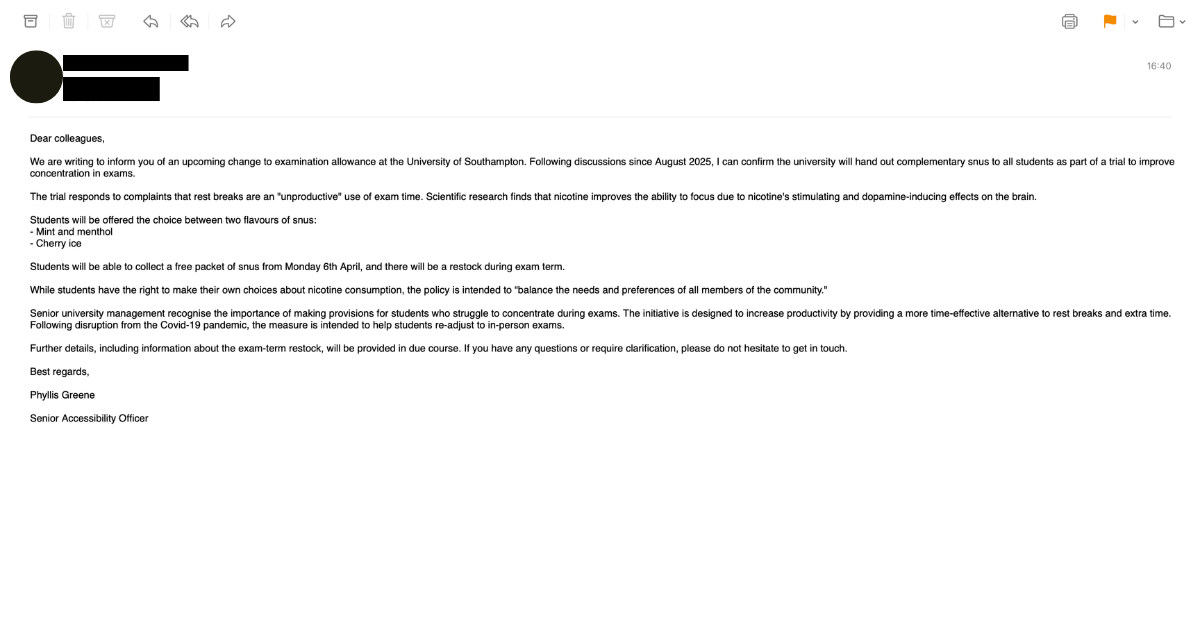 The email confirmed that every student will be able to collect a free pack of snus at the Students’ Union from Monday next week (6th April), and that there will be a restock as exams draw closer.