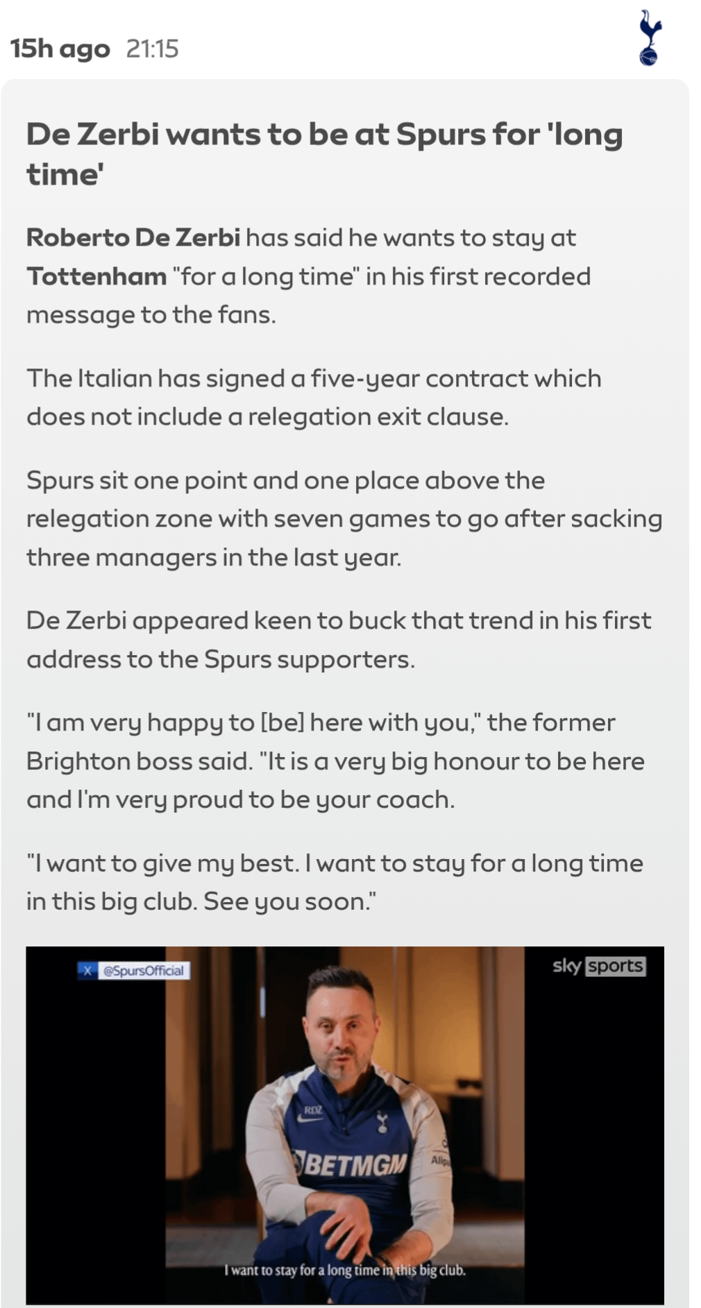 Roberto De Zerbi has said he wants to stay at Tottenham "for a long time" in his first recorded message to the fans.