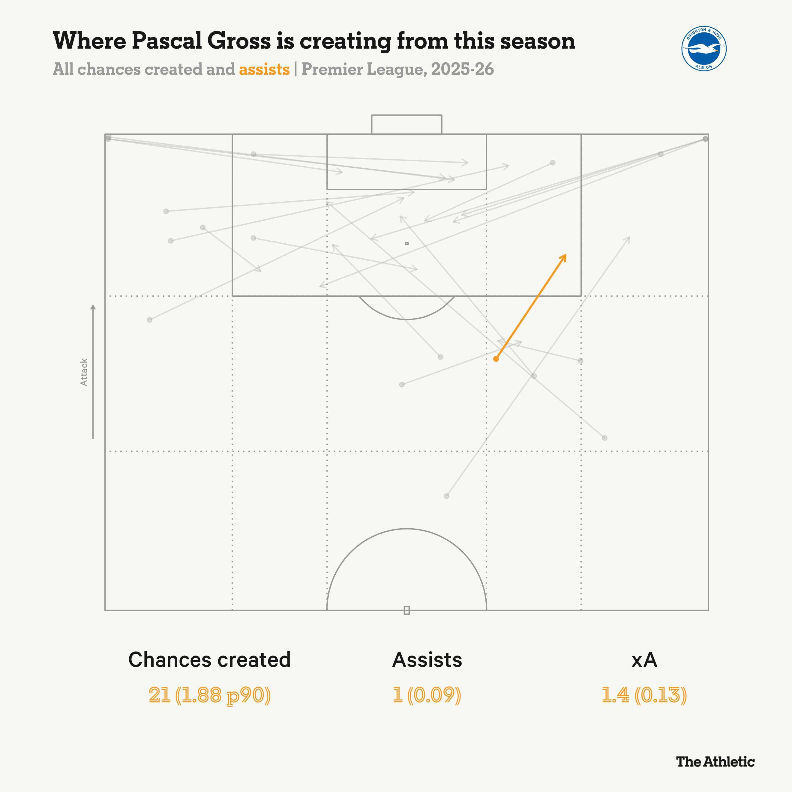 Gross has been involved in all 12 league games in 2026, starting the last 11 of those matches since his second spell at the club began off the bench in the second half of a 2-0 home victory over Burnley. He scored in a 1-1 draw against Everton at the Amex Stadium, provided a passing assist for Diego Gomez to open the scoring in a 2-1 home win against Nottingham Forest and has played every minute of the last seven fixtures.
