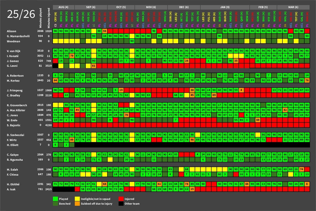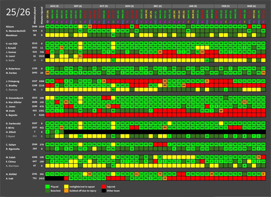 Liverpool player availability tracker 25/26, updated for april, I've made 2 versions, one with only first team players who've played this season (slide 1) and one with youth players included (slide 2).