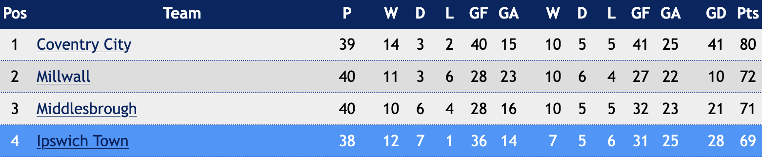 The Blues, who aren’t in action today with their game at Southampton postponed due to the Saints’ FA Cup progress, are three points behind Millwall and two behind Boro but with two games in hand on them both and with the best goal difference.
