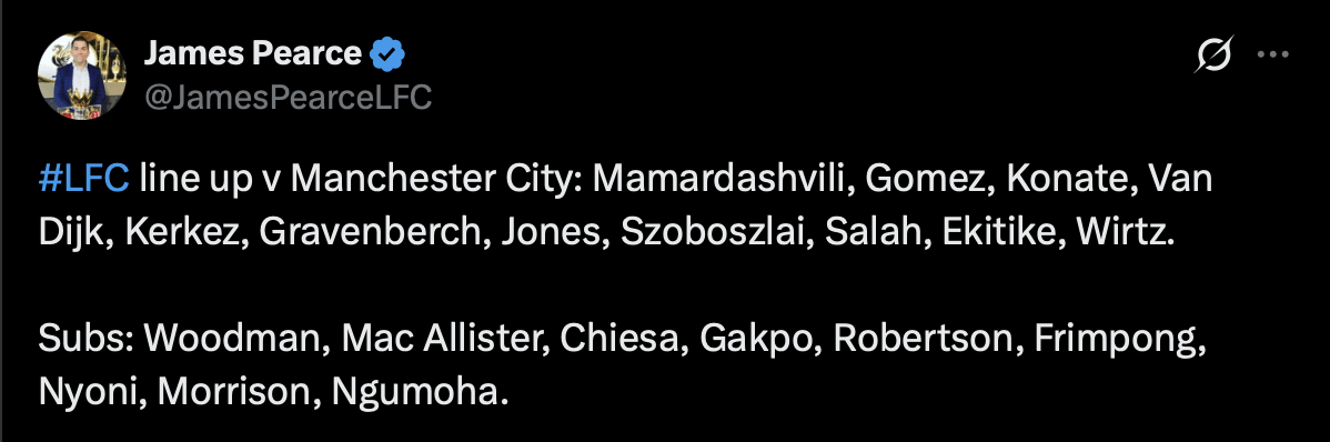 Starting XI: Liverpool vs. Man City: Mamardashvili, Gomez, Konate, Van Dijk, Kerkez, Gravenberch, Jones, Szoboszlai, Salah, Ekitike, Wirtz. Subs: Woodman, Mac Allister, Chiesa, Gakpo, Robertson, Frimpong, Nyoni, Morrison, Ngumoha.