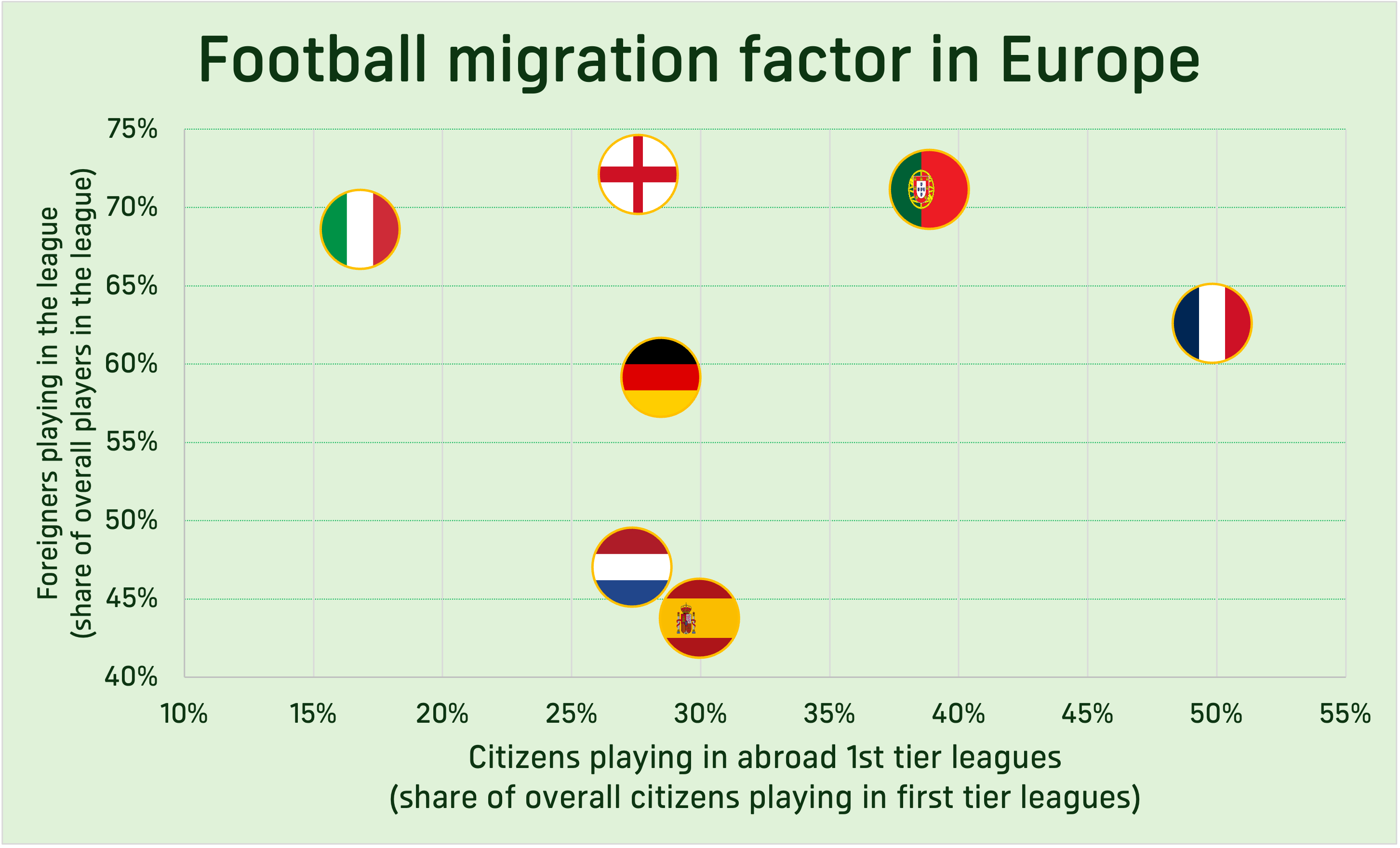 However, the data do not really support this view. Italy does have a significant share of foreign players in Serie A, but this is not dramatically different from other major European leagues. The real gap, compared to countries like France, Spain, or Germany, lies elsewhere: far too few Italian players are actually playing abroad. In this respect, Italy lags behind almost every other top footballing nation.
