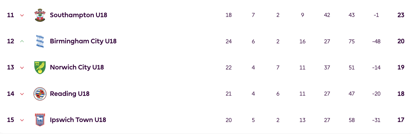 The young Blues, beaten 4-3 away by fellow strugglers Birmingham a fortnight ago, remain bottom of U18s Premier League South but with games in hand on the teams immediately above them. The Saints are 11th having played two fewer matches than Town.