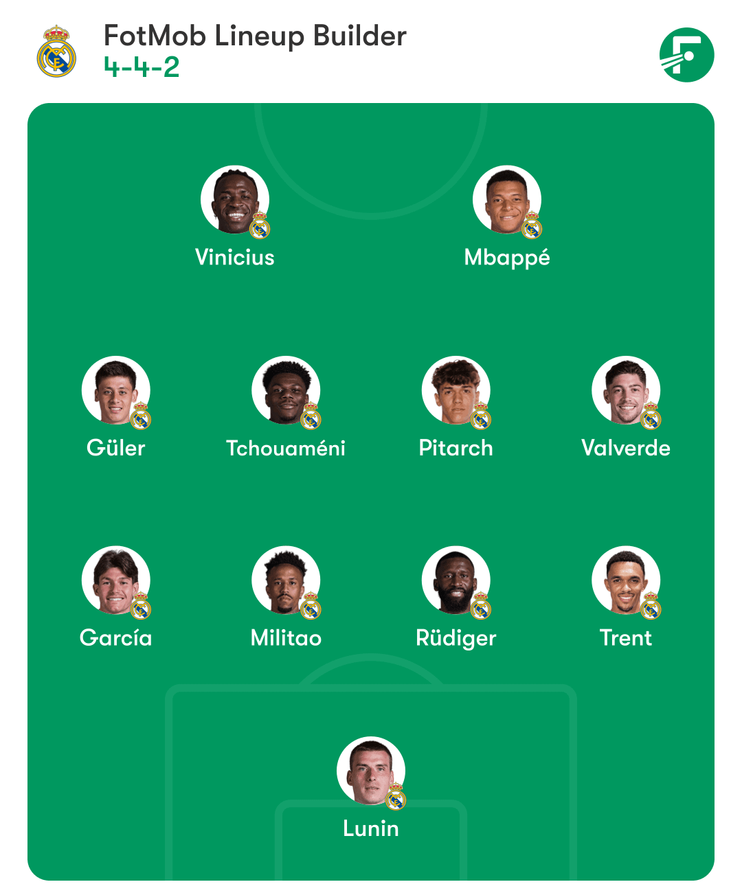 Real Madrid: Lunin; Fran García, Éder Militão, Rüdiger, Trent; Arda Güler, Tchouaméni, Pitarch, Valverde; Vinícius Júnior, Mbappé