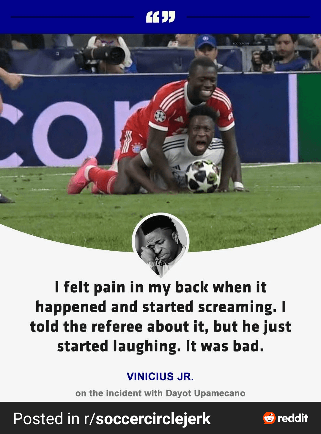 Vini’s highlights dives and cries when he doesn’t get a penalty. He is lucky he did not get yellow carded for acting.