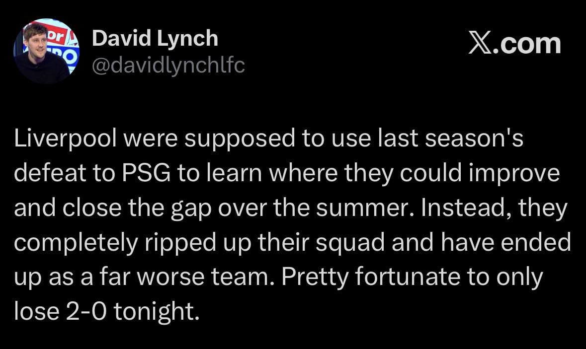 [Lynch] Liverpool were supposed to use last season’s defeat to PSG to learn where they could improve and close the gap over the summer. Instead, they completely ripped up their squad and have ended up as a far worse team. Pretty fortunate to only lose 2-0 tonight.