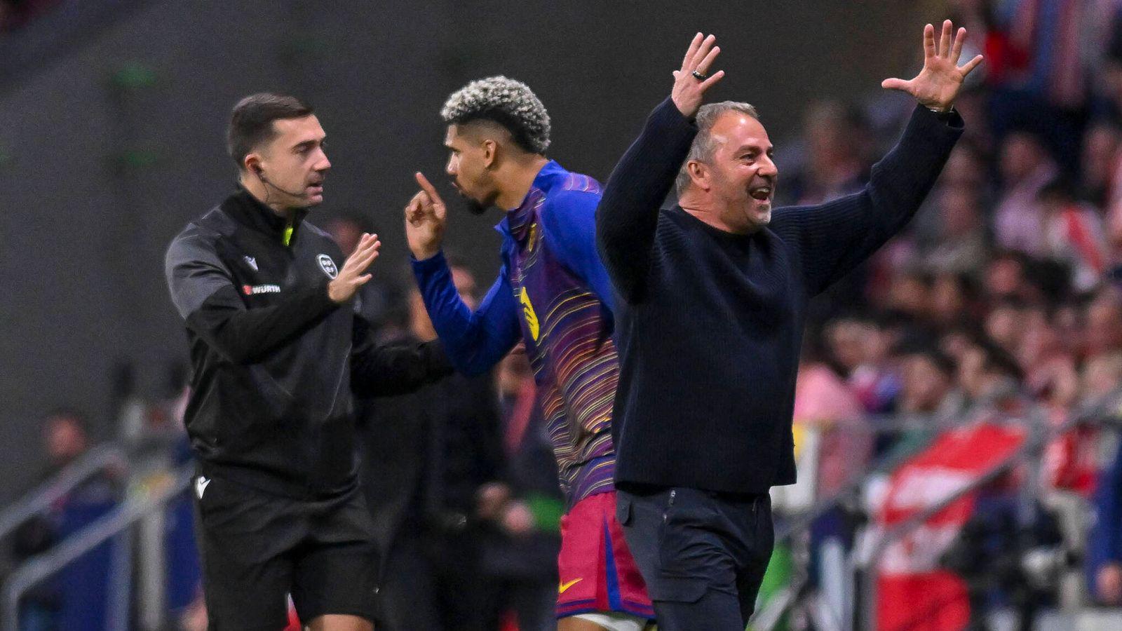 Barca-Coach Hansi Flick tobt wegen skurriler Handspiel-Szene beim CL-Spiel gegen Atlético über deutschen Schiedsrichter Christian Dingert: “Der VAR war sehr auf Atlético ausgerichtet. Es war ein Deutscher, danke Deutschland.”