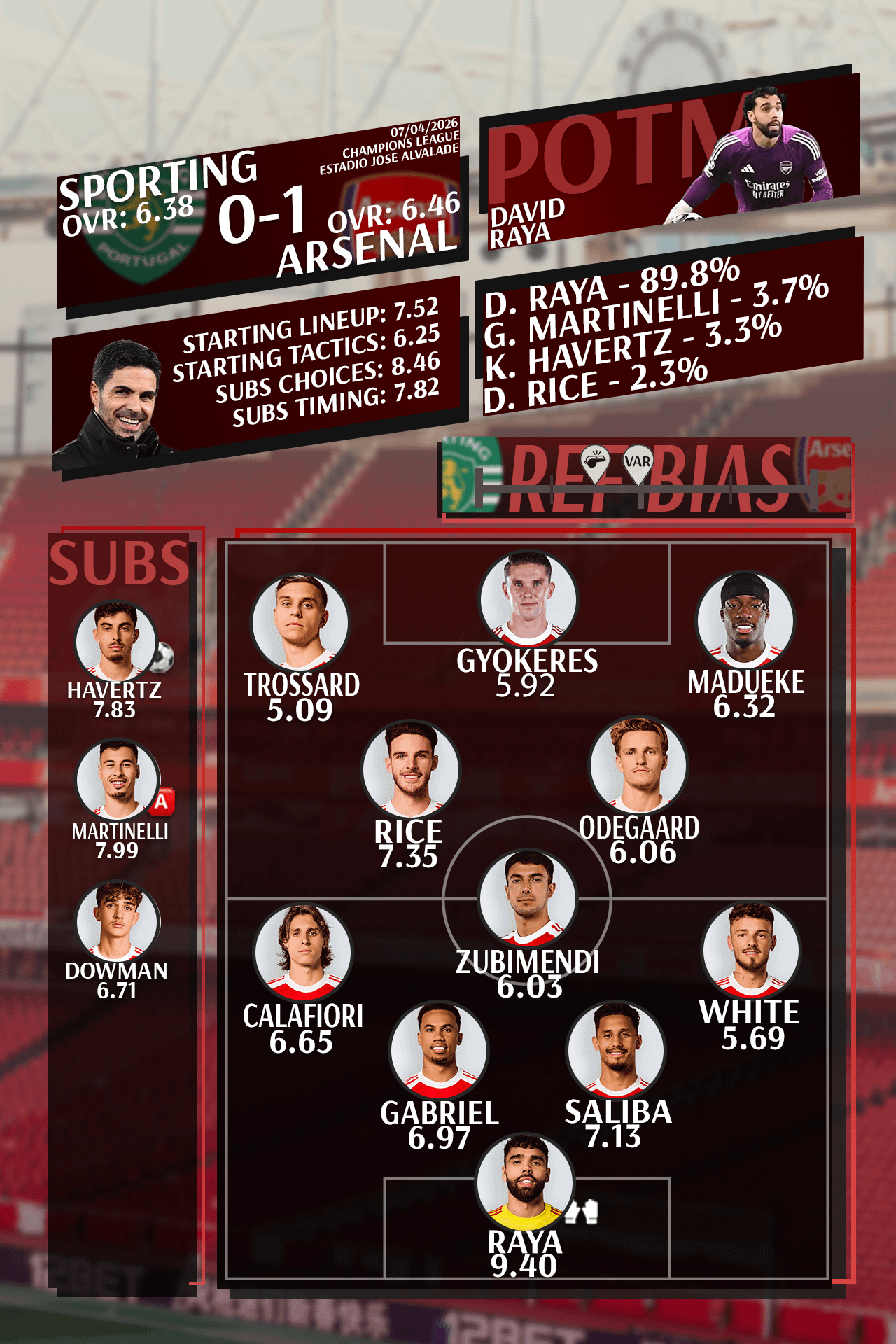 13. David Raya 9.40 – Sporting Away 25/26