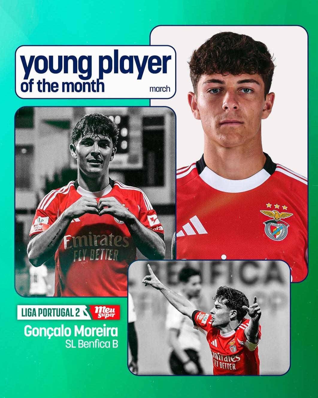 O Jovem do Mês da Liga Portugal 2 Meu Super, referente a março, é Gonçalo Moreira, do SL Benfica B, com 13,68% dos votos dos treinadores da prova.