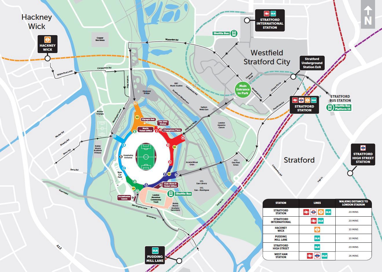Parking: London Stadium is a green stadium and a public transport destination, so public car parking is not available. Supporters are advised to use the many public transport options. Chargeable parking may be available at Westfield Stratford City.