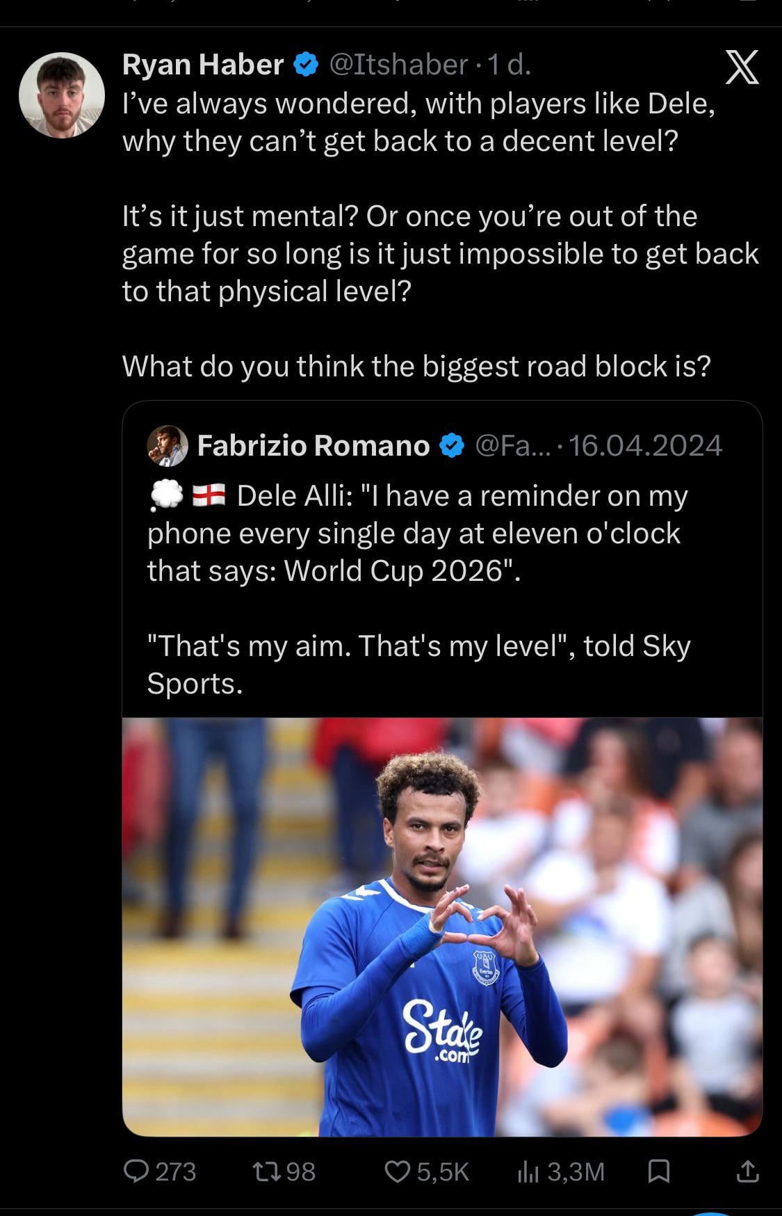 I think there are other factors but, imo, he was a player who played on instinct to a very, very high degree. I think that relies on a high degree of confidence. My recollection is that he could be quite loose in possession at times because he just backed his instinctive ability so much. He relied heavily on that lack of fear that commentators so often talk about in young players. I think he just got inside his own head and started second guessing himself in his decision making. I think once that starts happening to you as that kind of player, it’s very hard. You need to try and adapt your game into something a bit more simple and pragmatic (eg like Adel Taarabt becoming a CM at Benfica for example). Dele just never really did that for whatever reason.
