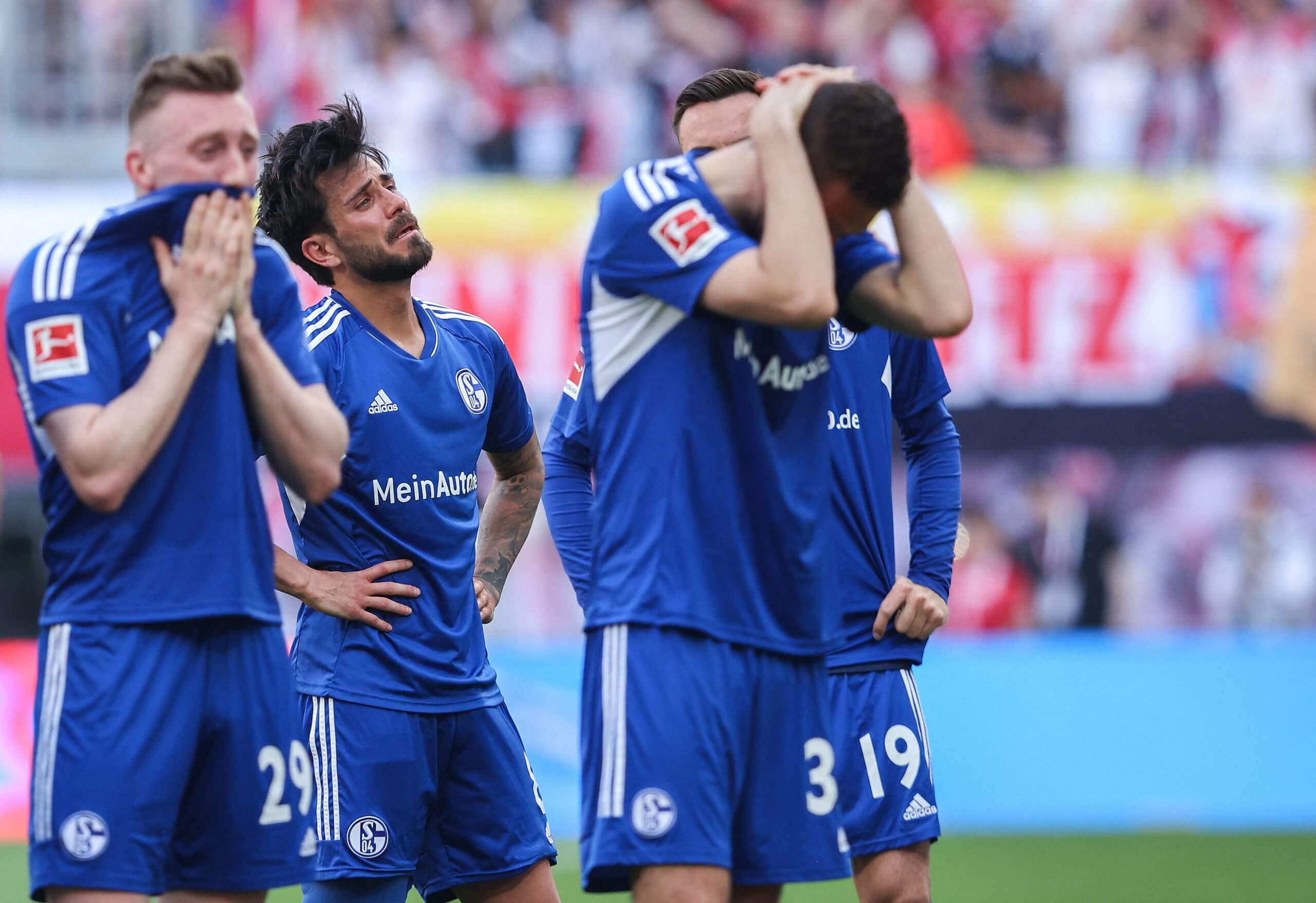 Devastated Schalke players after they were relegated from the 2020-21 Bundesliga (Ronny Hartmann/AFP via Getty Images)