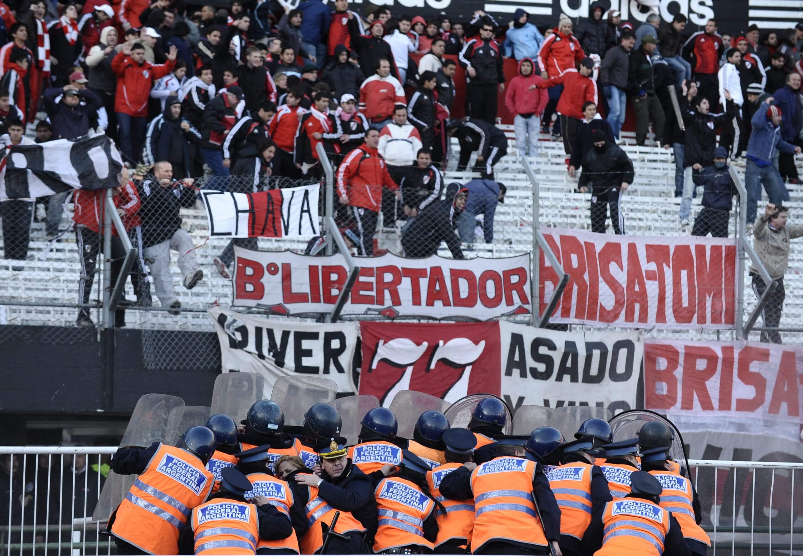 The game that sealed their fate, at River’s Monumental stadium, had to be abandoned and players helped to get off the pitch as the crowd rioted with the home side 3-1 down on aggregate in a promotion/relegation play-off with a minute of the 90 to go. Police then battled to disperse rampaging supporters after the first relegation in the club’s then 110-year history. Dozens of people were reportedly injured.