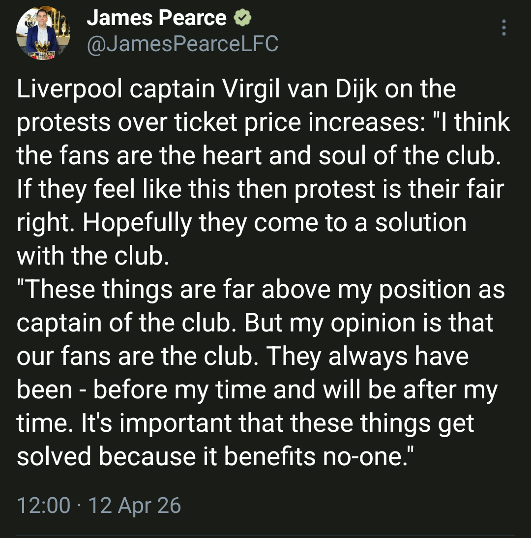 [Pearce] Liverpool captain Virgil van Dijk on the protests over ticket price increases: “I think the fans are the heart and soul of the club. If they feel like this then protest is their fair right. Hopefully they come to a solution with the club.”