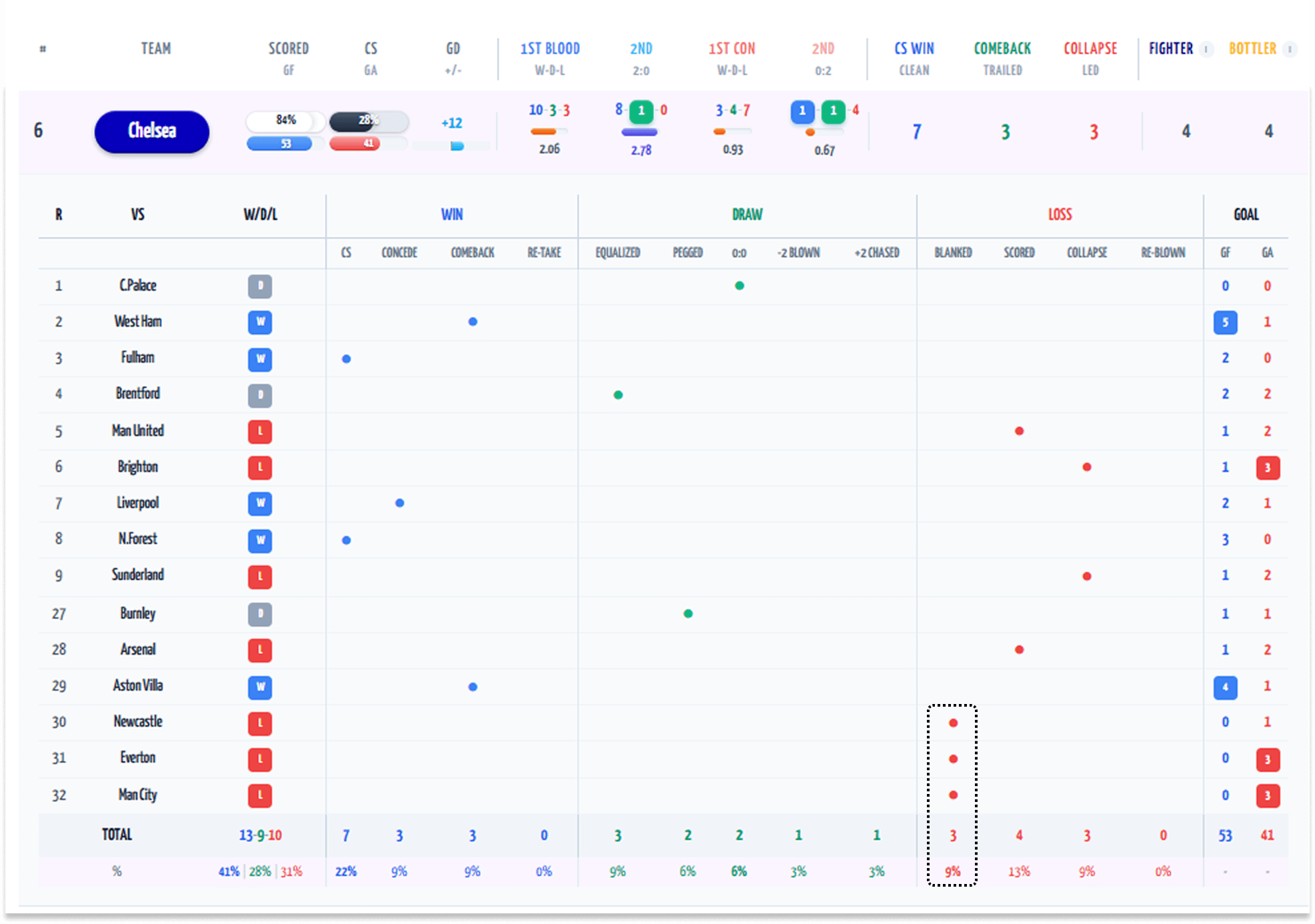 Chelsea's Match DNA this season. Since Rosenior took over, Chelsea have had their first scoreless defeats of the season — and it's 3 in a row. 0-1 (Newcastle), 0-3 (Everton), 0-3 (Man City). Every single "Blanked" entry this entire season belongs to Rosenior. Is this really what progress looks like?