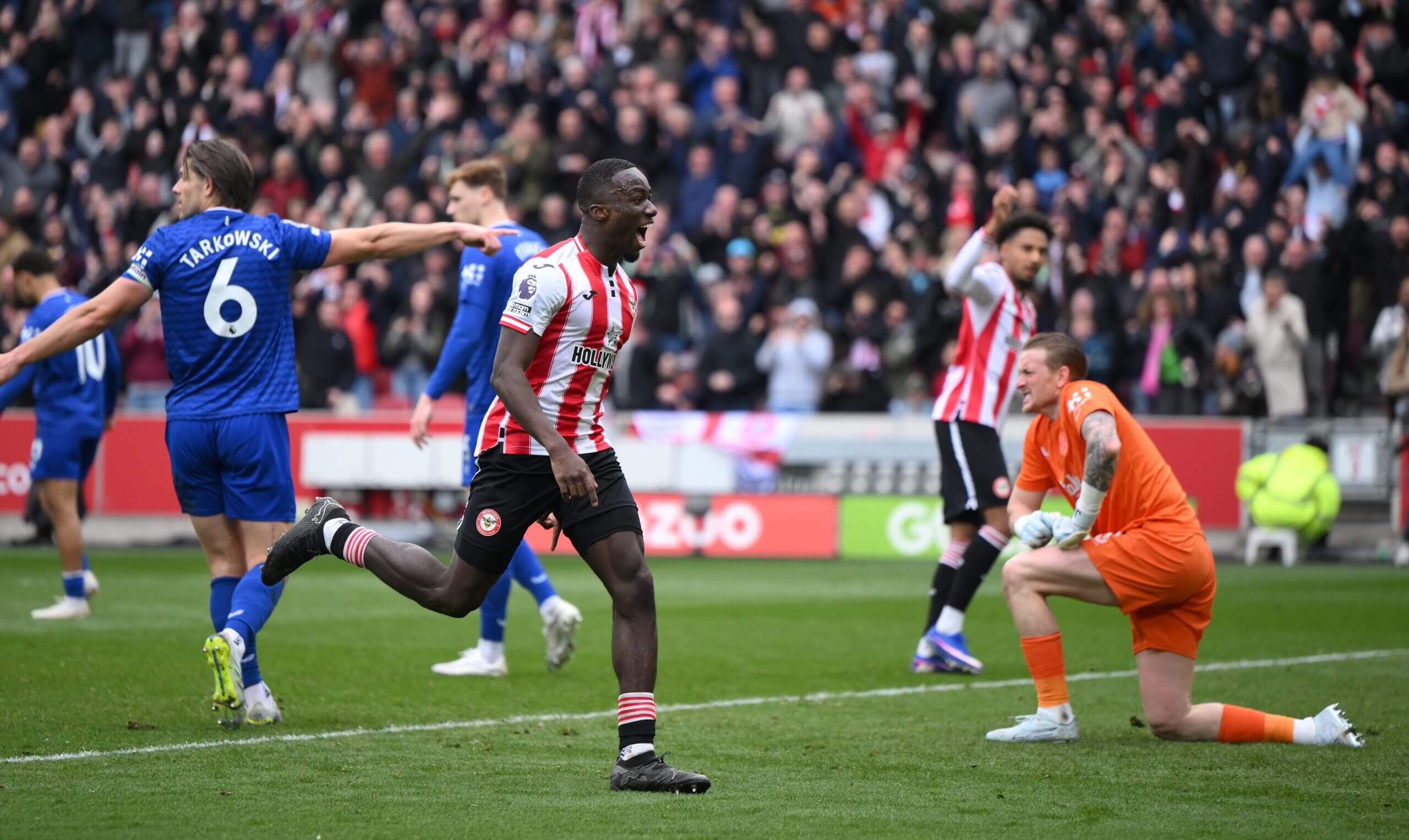 Michael Kayode celebrates Brentford’s second goal as James Tarkowski shows his frustration (Alex Broadway/Getty Images)