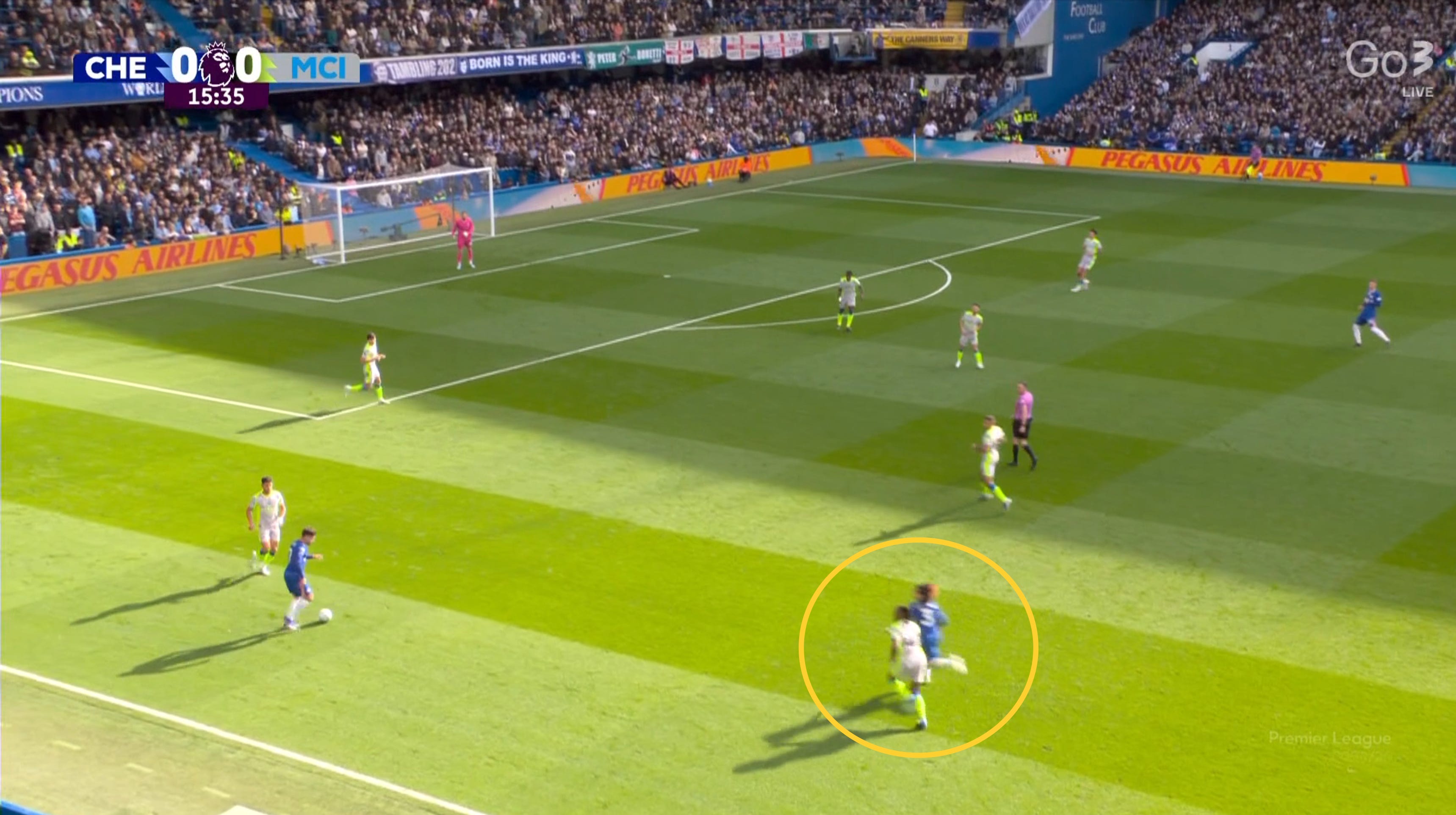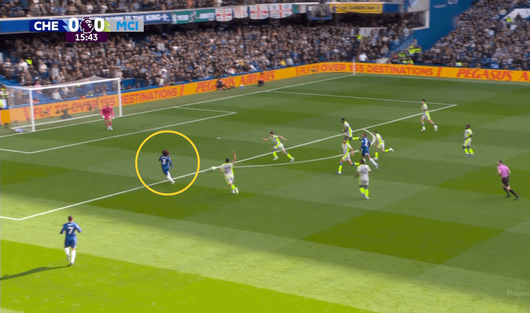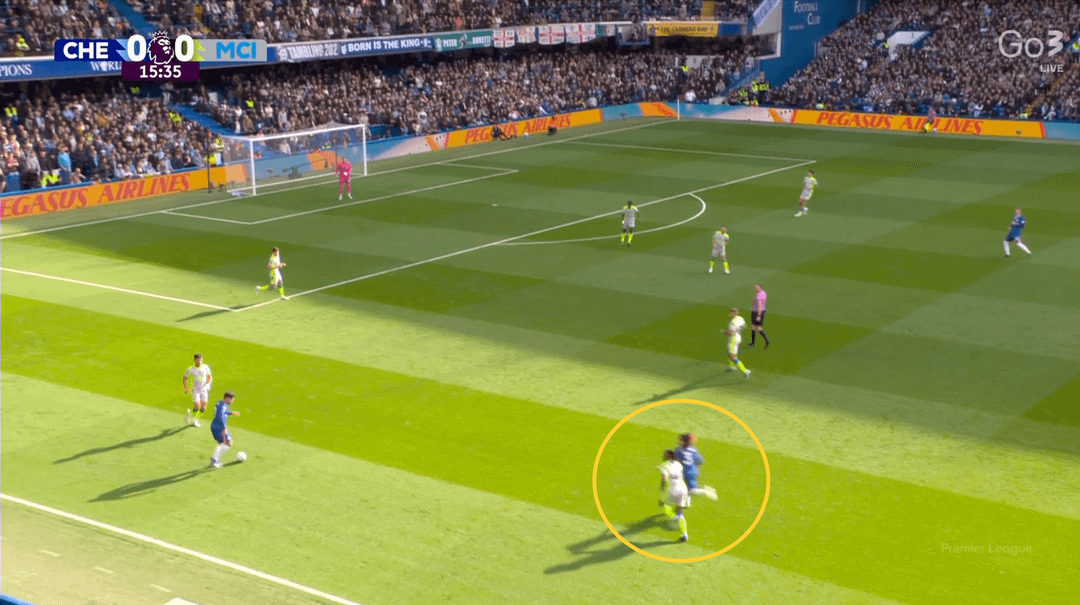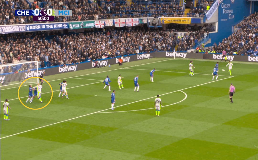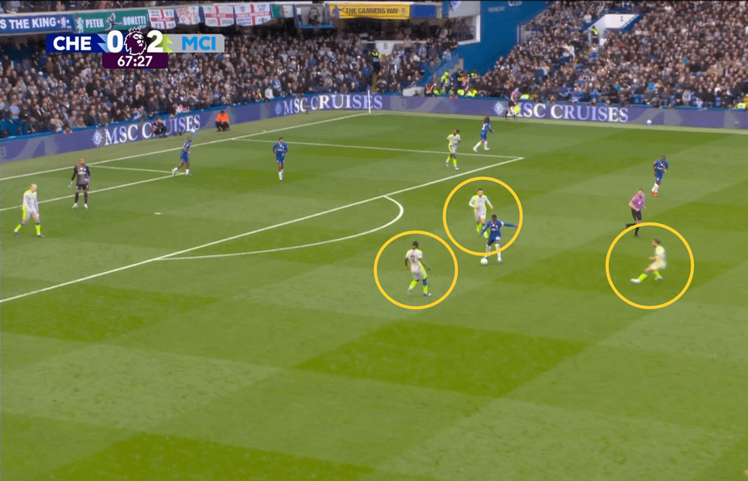 Chelsea created three dangerous attacks in the first half (all down the left) and even scored — but the goal was ruled out for a marginal offside on Cucurella. I’ve said many times this season that Matheus Nunes has been City’s standout player in terms of development, consistency and confidence in his new role. Rewatching the game, I focused on his positioning during Chelsea’s dangerous sequences on his flank.